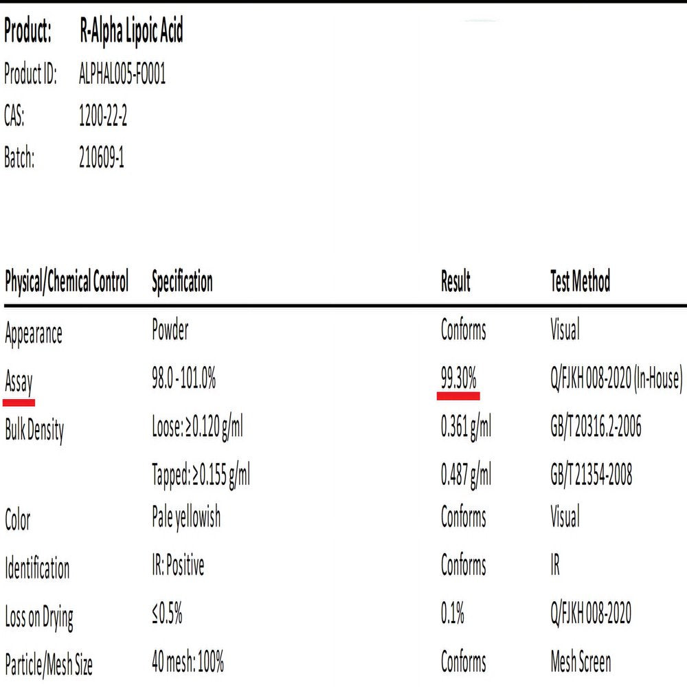 ✅✅ Our R-ALA supplement is of the highest quality possible, test results show it's nearly 100% pure. There is a snippet of the certificate of analysis among the product pictures.