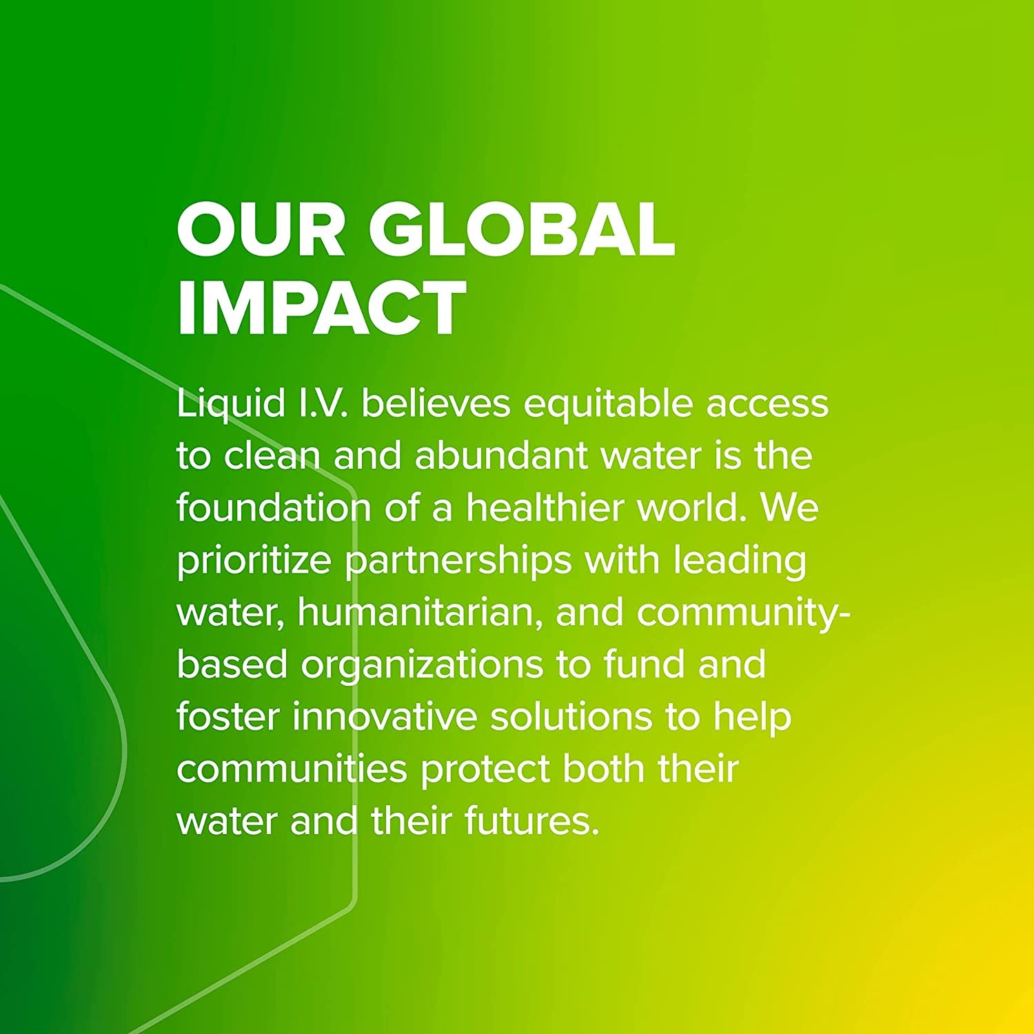 - Global impact – Liquid I.V. believes equitable access to clean and abundant water is the foundation of a healthier world. We prioritize partnerships with leading water, humanitarian, and community-based organizations to fund and foster innovative solutions to help communities protect both their water and their futures.