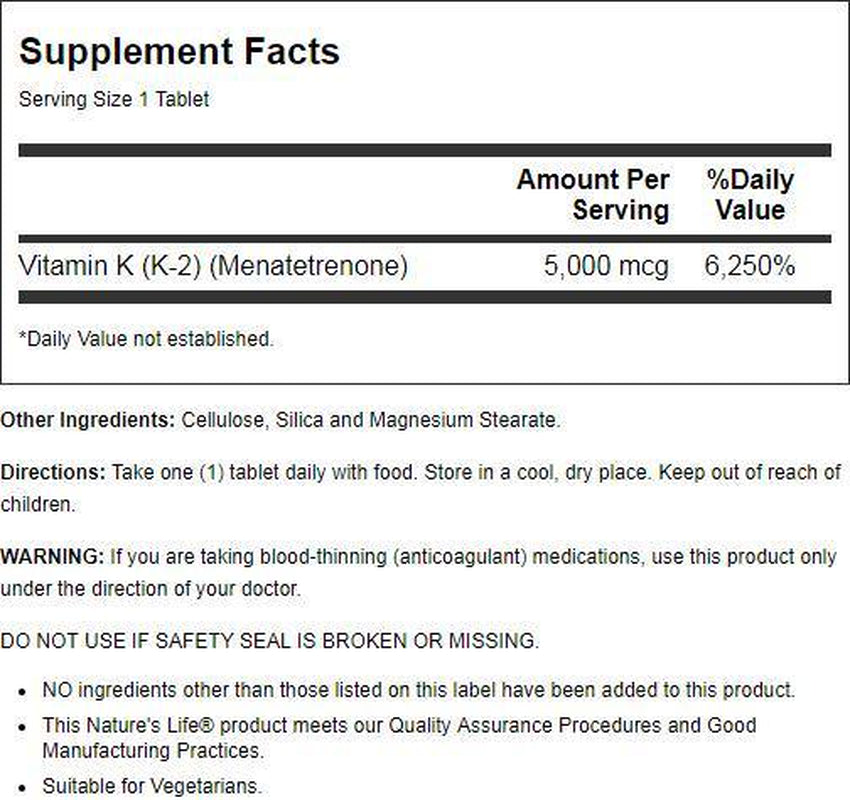Natures Life higher potency formula provides 5000 mcg of K2 in its mk-4 (Menatetrenone) form for fast absorption. Taking this K2 supplement regularly, along with calcium and vitamin D, may help support calcium absorption and distribution for strong bones and healthy cardiovascular function.