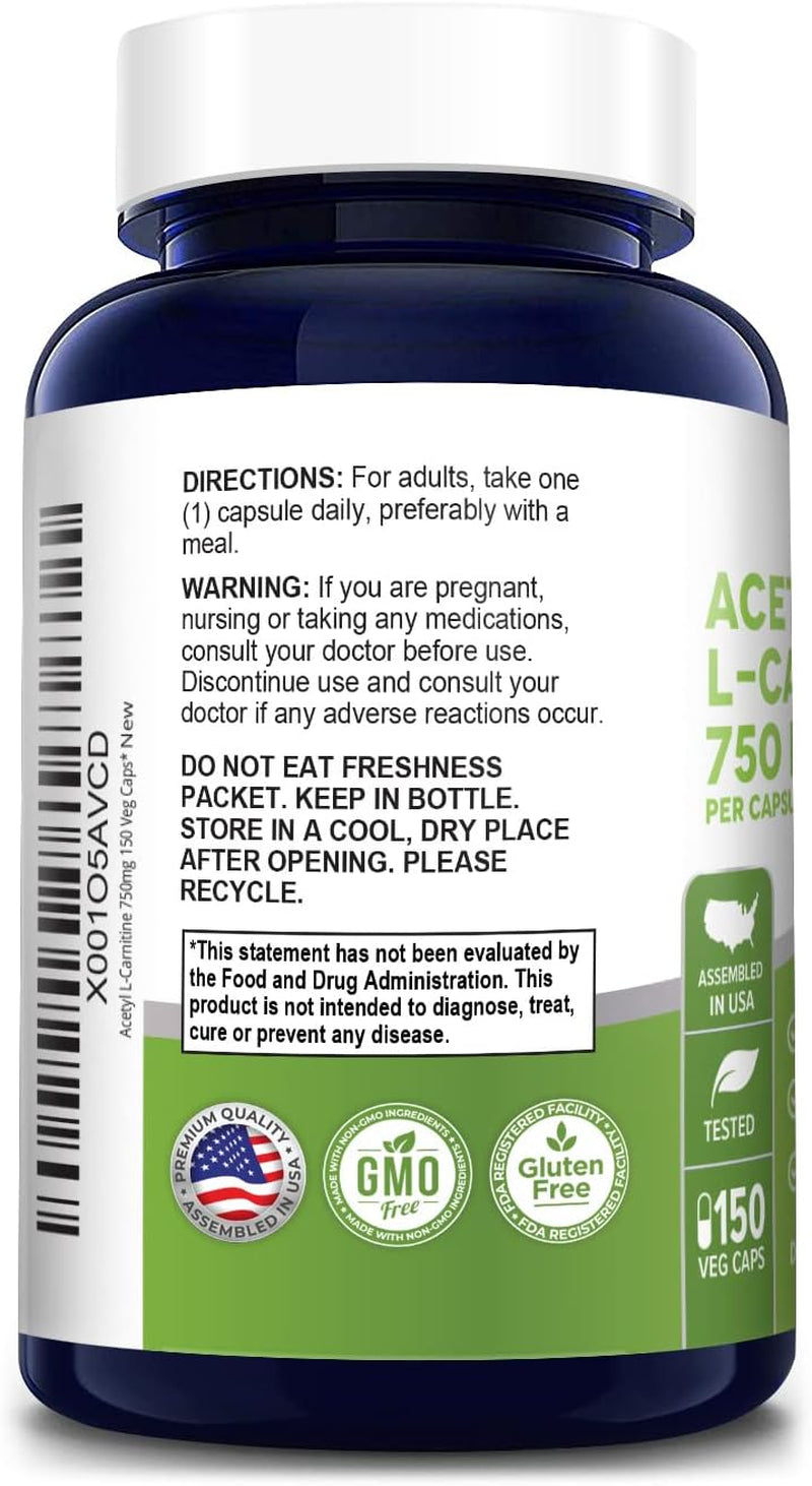 150 DAY SUPPLY150 veggie capsules / a 150-Day Supply (Each serving is 1 veg. caps.) | VEGAN CAPSULESNON-GMO and Gluten-Free | ACETYL L-CARNITINE 750MG PER CAPSULE |