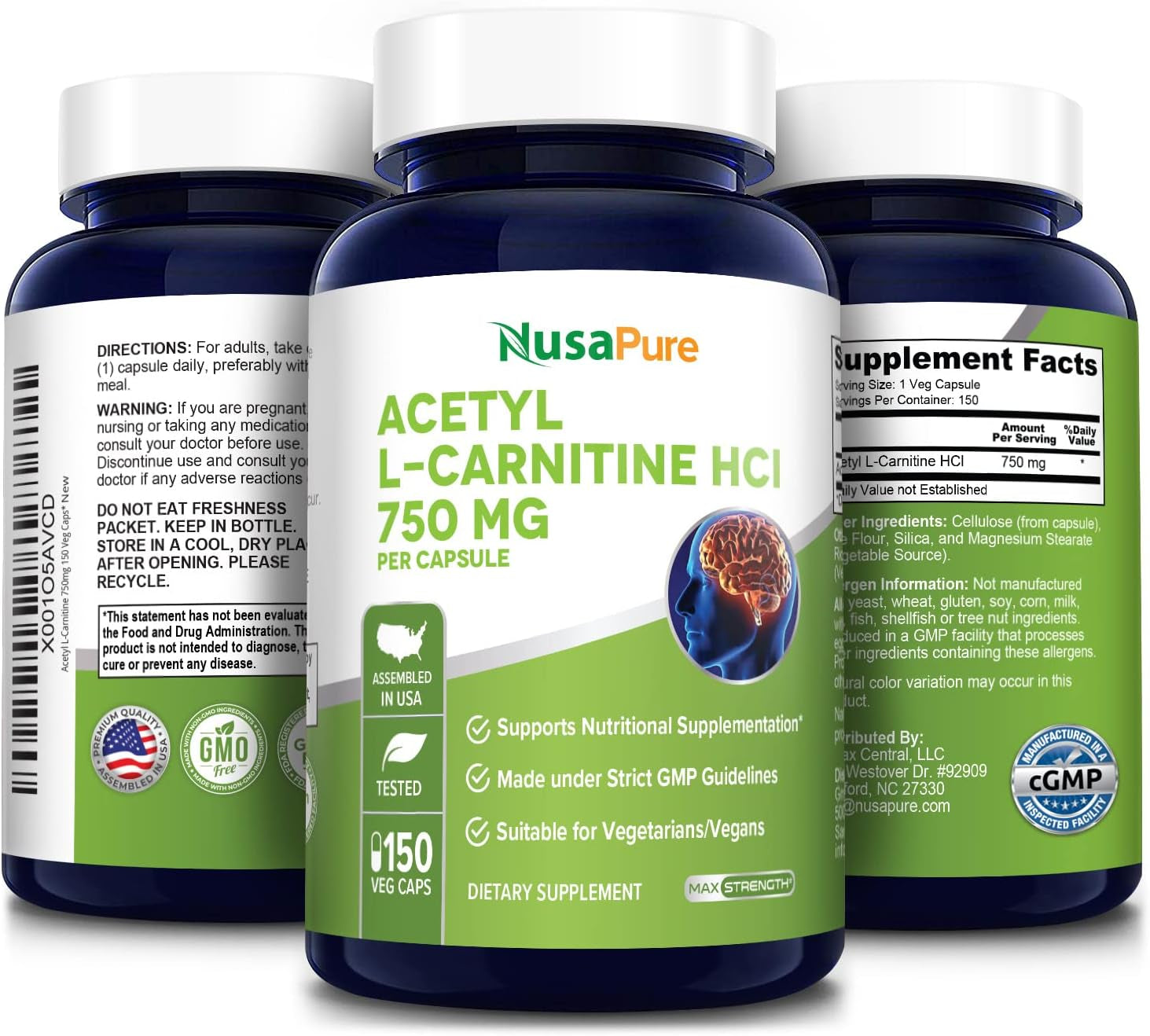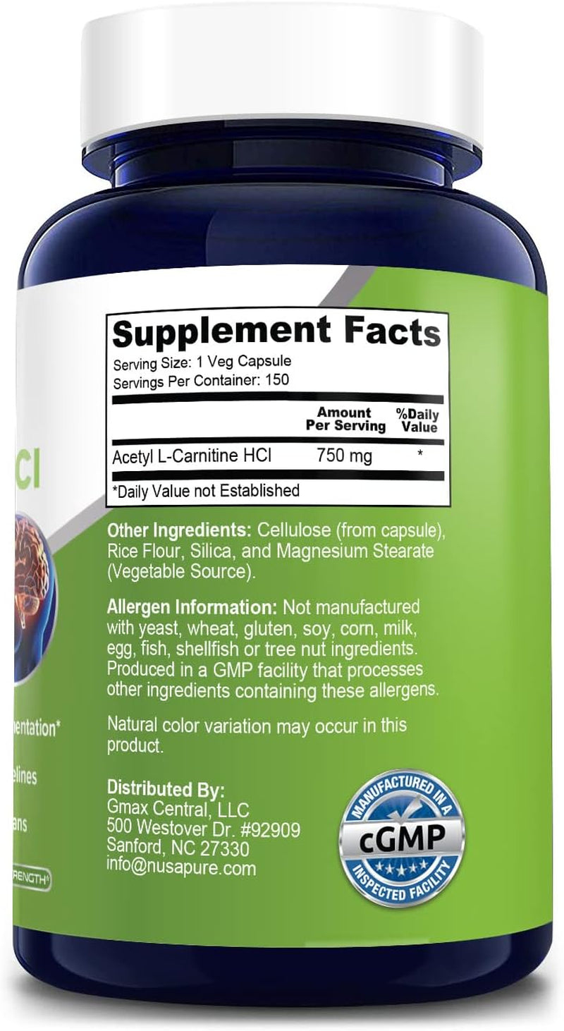 Nusapure Acetyl L-Carnitine 750Mg per Caps 150 Veggie Capsules (Non-Gmo, Gluten Free) High Potency Acetyl L Carnitine HCL (ALCAR)