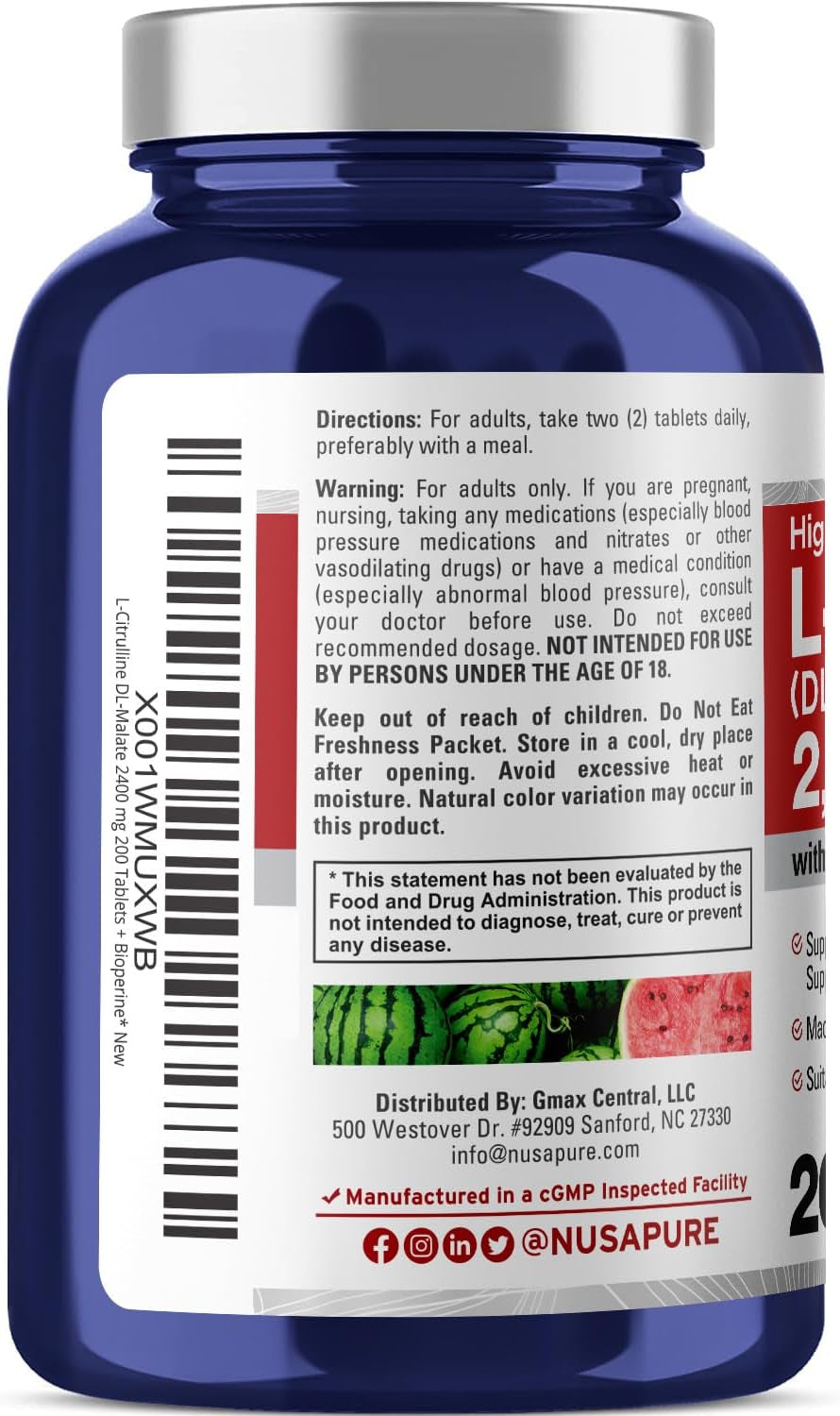 Nusapure L-Citrulline 2,400Mg 200 Vegetarian Tablets (Non-Gmo, Gluten Free, 100-Day Supply, Bioperine)