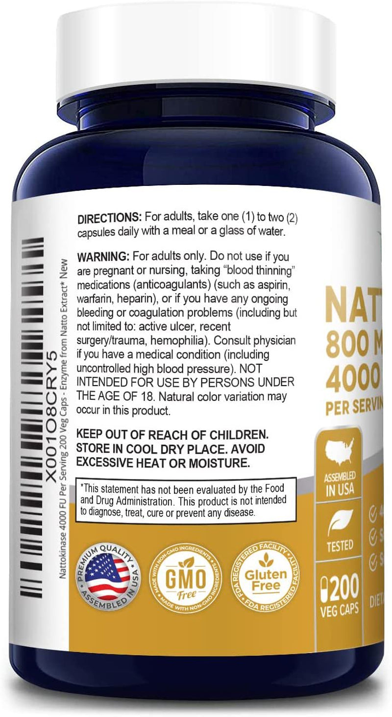 Nusapure Nattokinase 800Mg: Potent 4000 FU Dietary Supplement Promoting Wellness & Health, 200 Veggie Capsules, Non-Gmo, Gluten-Free, for Unisex Adult