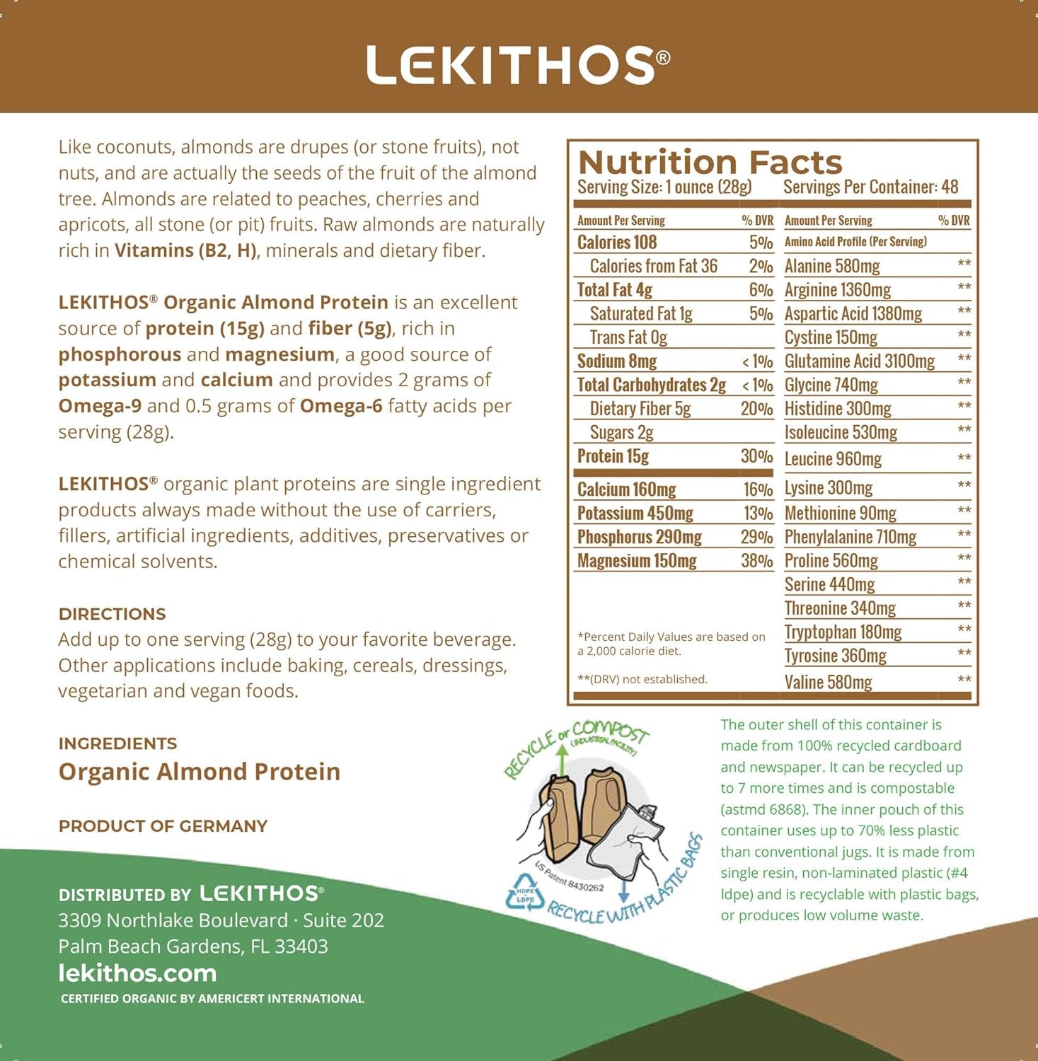 Like coconuts, almonds are drupes (or stone fruits), not nuts, and are actually the seeds of the fruit of the almond tree. Due to their bioavailability of nutrients and various health benefits, Lekithos Organic Almond Protein serves as a strong alternative choice for those who wish to avoid soy and whey protein (dairy). Our almond protein is also rich in is Glutaminic Acid. This amino acid can provide benefits in digestive function and prevent the breakdown of your muscle cells, making this a common nutritive addition to people who workout for prolonged periods of time.