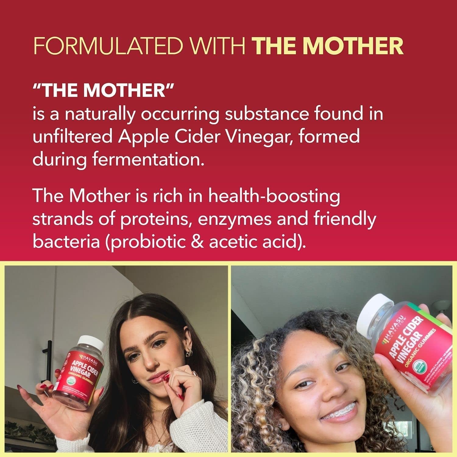 - Our lab experts use organic apples with "the mother" and organic yeast to ferment sugars and turn them into beneficial alcohols. Next, good microorganisms are added to turn it into organic acetic acid - the main component in our apple cider vinegar gummies that help improve energy level, heart health, immunity, detox cleanse, digestive relief, and metabolism support. No low-grade ingredients that other competitors add to their ACV to hide the quality of their gummies!