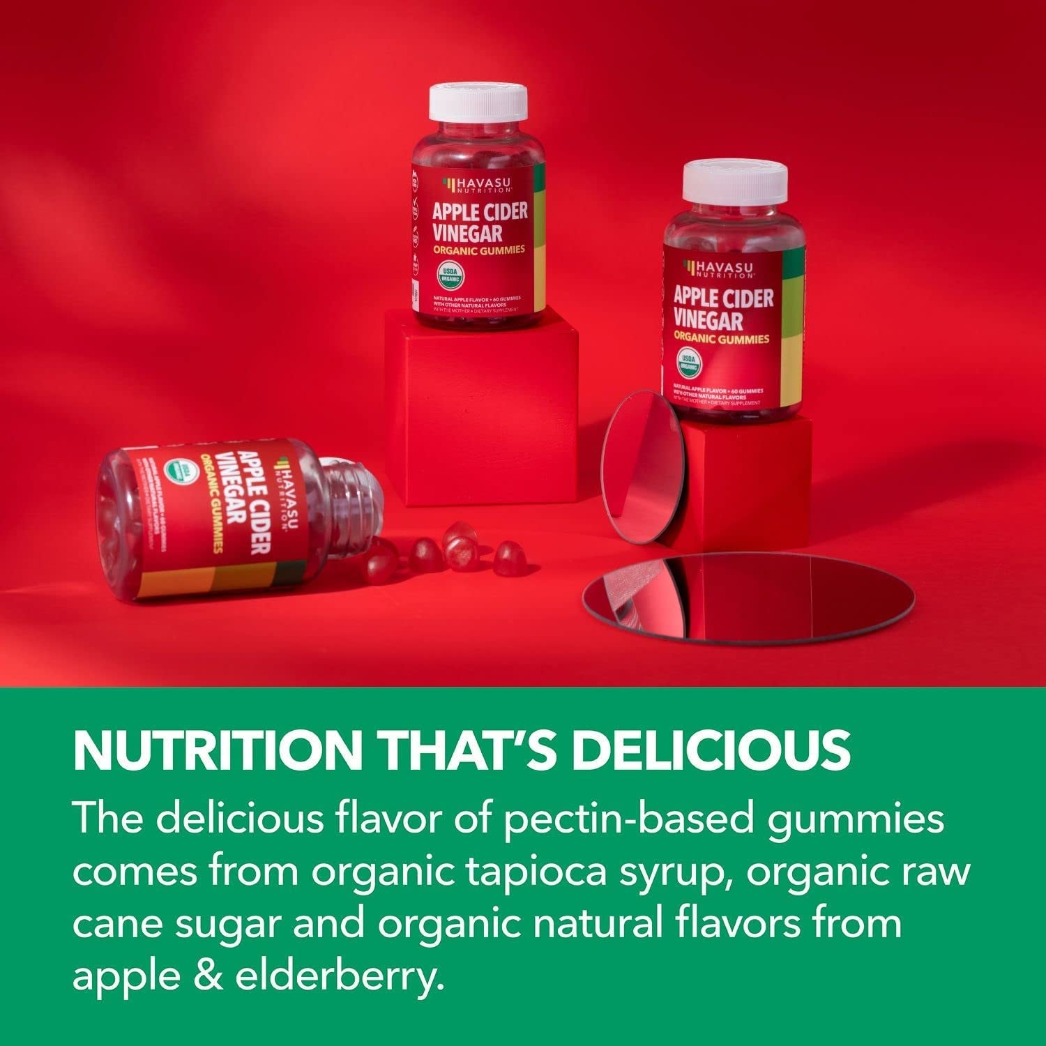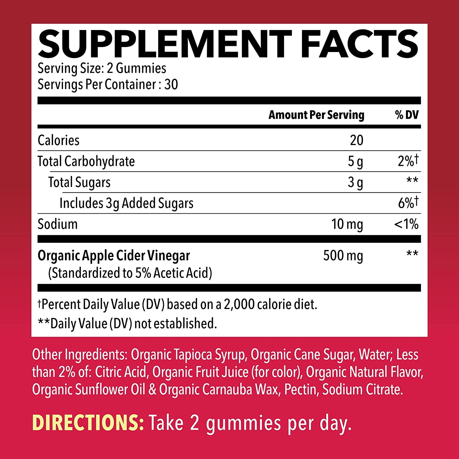 - Vegan, Organic, Non-gmo, Gluten Free & Gelatin Free! Each bottle of our apple cider vinegar gummies contains 60 delicious gummies that are good for you and your new workout routine for the new year!