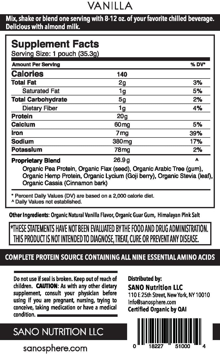 HIGH IN PROTEIN + NO SUGARComplete plant-based protein that is loaded with 20 grams of clean protein from hemp seeds, peas, and flax and includes all nine essential amino acids. Did we mention our highly curated formulas include 0 grams of sugar too?! | PREMIUM ORGANIC INGREDIENTSUSDA Organic, Vegan, Non GMO, Keto, Gluten Free, Dairy Free, Soy Free, Sugar Free. Our expert nutrient dense formulas are also free of artificial sweeteners and sugar alcohols, dyes or coloring, and preservatives. See nutritional label for more details (Certificate #C0031255, Issued 4/13/2018). | DELECTABLE TASTE PROFILEExperience SANO's premium plant based protein that is found at several boutique fitness studios, organic health stores, and luxury hotels, to name a few. Try our premium plant based nutrition today--your're sure to love them! |
