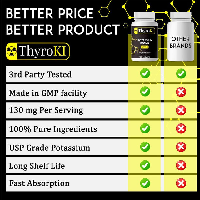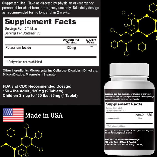 Potassium Iodide Radiation Tablets Fast Dissolving Tablets 130 mg (150 Tablets) | Ki Pills Iodine Tablets | Anti Nuclear Fallout Pills | Magnesium Supplement | Thyroid Support | Dietary Supplement | YODO Naciente- Potassium Iodide (KI) is a stable iodine salt. Taking a stable iodine helps the thyroid absorb and be "full" of iodine. The body does not produce Iodine naturally, which makes 130 mg Potassium Iodide Pills perfect for emergency or survival kits. Potassium Iodate tablets are used at the time of a nuclear emergency; the tablets stop the thyroid gland (situated in your neck) taking up radioactive iodine, which may be released into the environment following a nuclear accident. What is potassium iodide and what is it used for? Potassium iodide (KI) is a chemical compound that can be used to protect the thyroid gland from possible radiation injury caused by radioactive iodine (radioiodine). Some radiological emergencies may release large amounts of radioiodine to the environment. Since iodine concentrates in the thyroid gland, inhalation or ingestion of food contaminated with the radioiodine can lead to radiation injury to the thyroid.