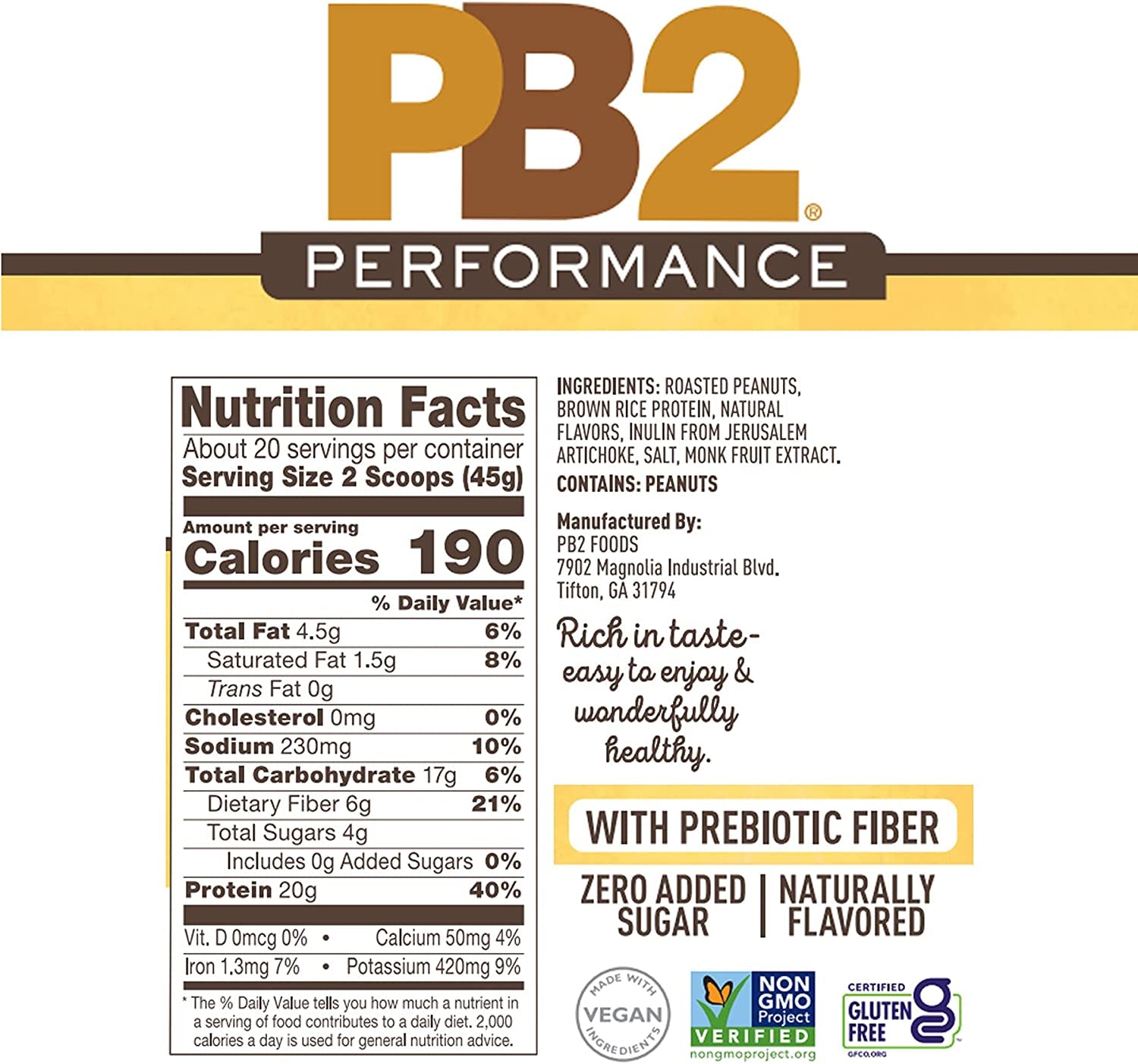 - THE BEST TASTING PLANT PROTEIN ON THE MARKET – Everybody knows that peanuts and vanilla tastes great. By adding a touch of brown rice protein, PB2 Performance delivers 20g of delicious and complete protein.