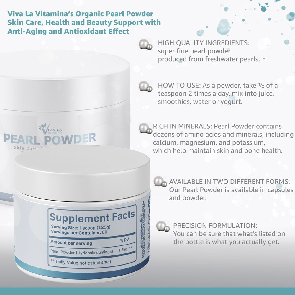 Pearl Powder Dietary Supplement from Freshwater Pearls - 100 Grams (80 Servings), NON-GMO