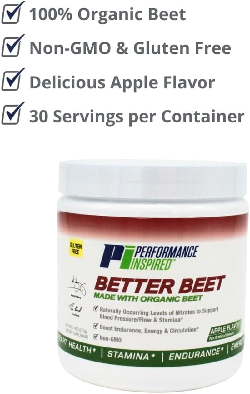 PERFORMANCE INSPIRED Nutrition Better Beet Powder - 100% Organic Beet – Boost Nitric Oxide – All-Natural Clean Energy - Boost Endurance – G-Free - Non-Gmo - Apple Flavor - 30 Servings