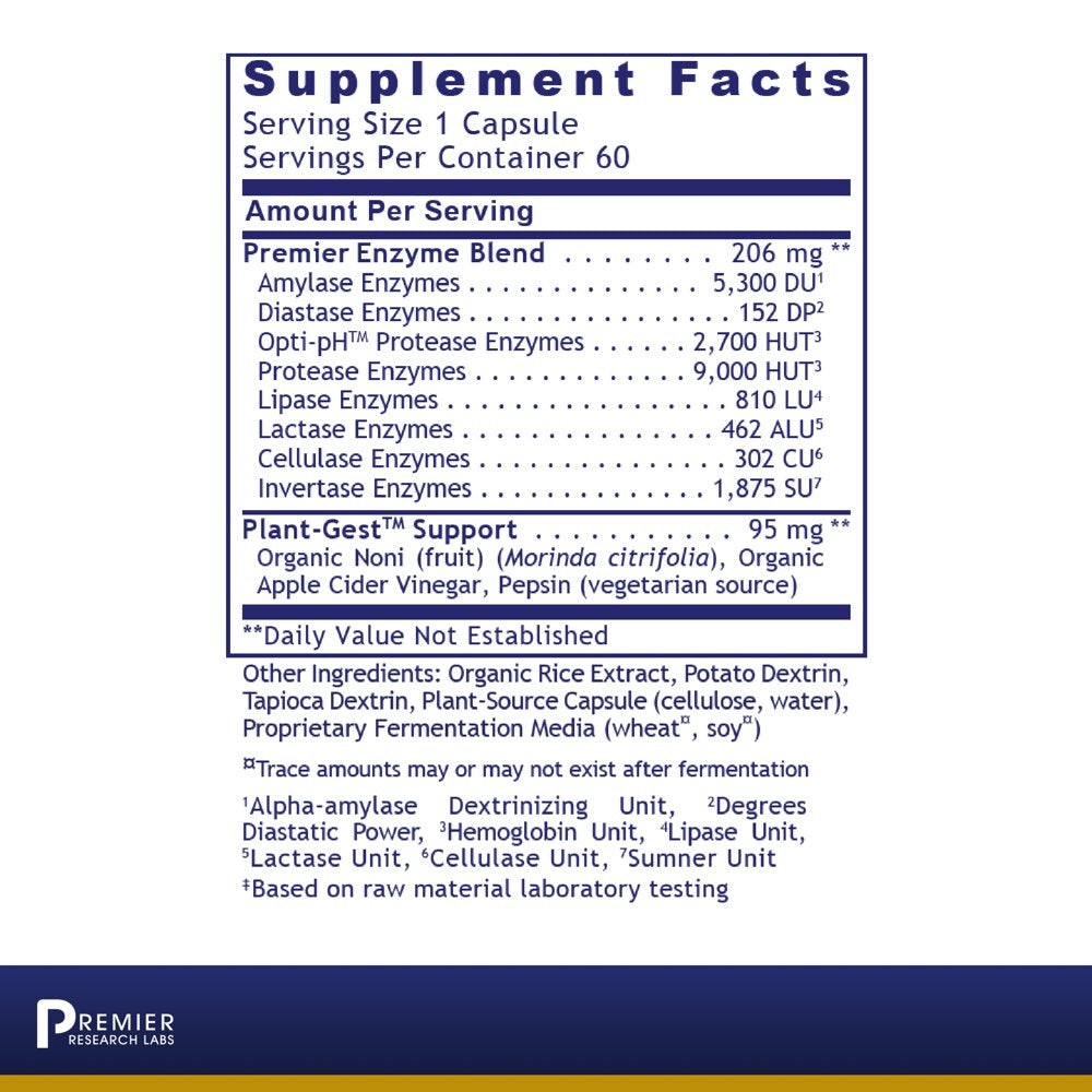 Premier Digest enzymes are anchored with the botanical blend, Plant-Gest Support, which contains noni, apple cider vinegar and pepsin (vegetarian source). Pepsin is a digestive enzyme that catalyzes the breakdown of protein into peptides and should be taken after every meal, especially if you’re taking a hydrochloric acid supplement. While most pepsin may be animal-based, our pepsin is vegetarian sourced. Thus, this plant enzyme formula is suitable for everyone, including vegetarians and vegans.