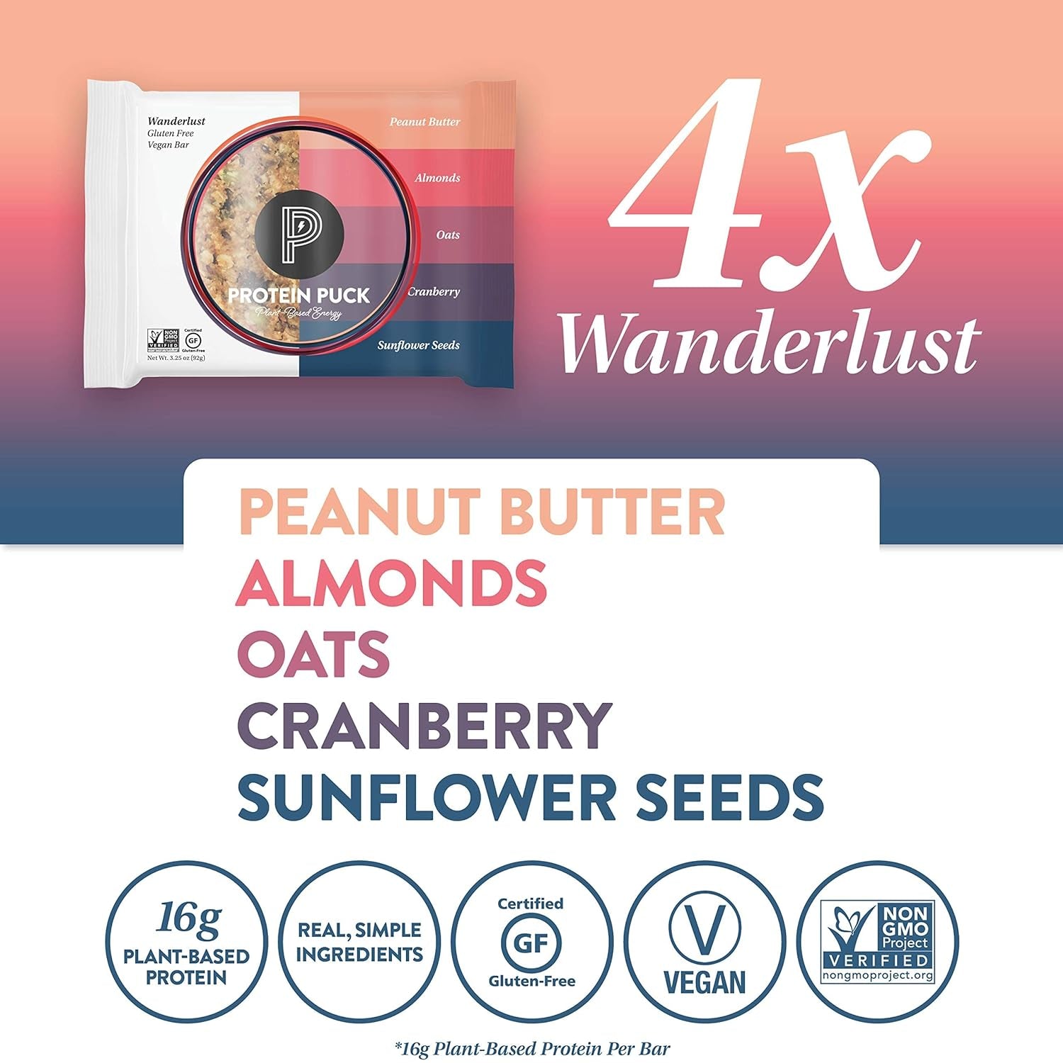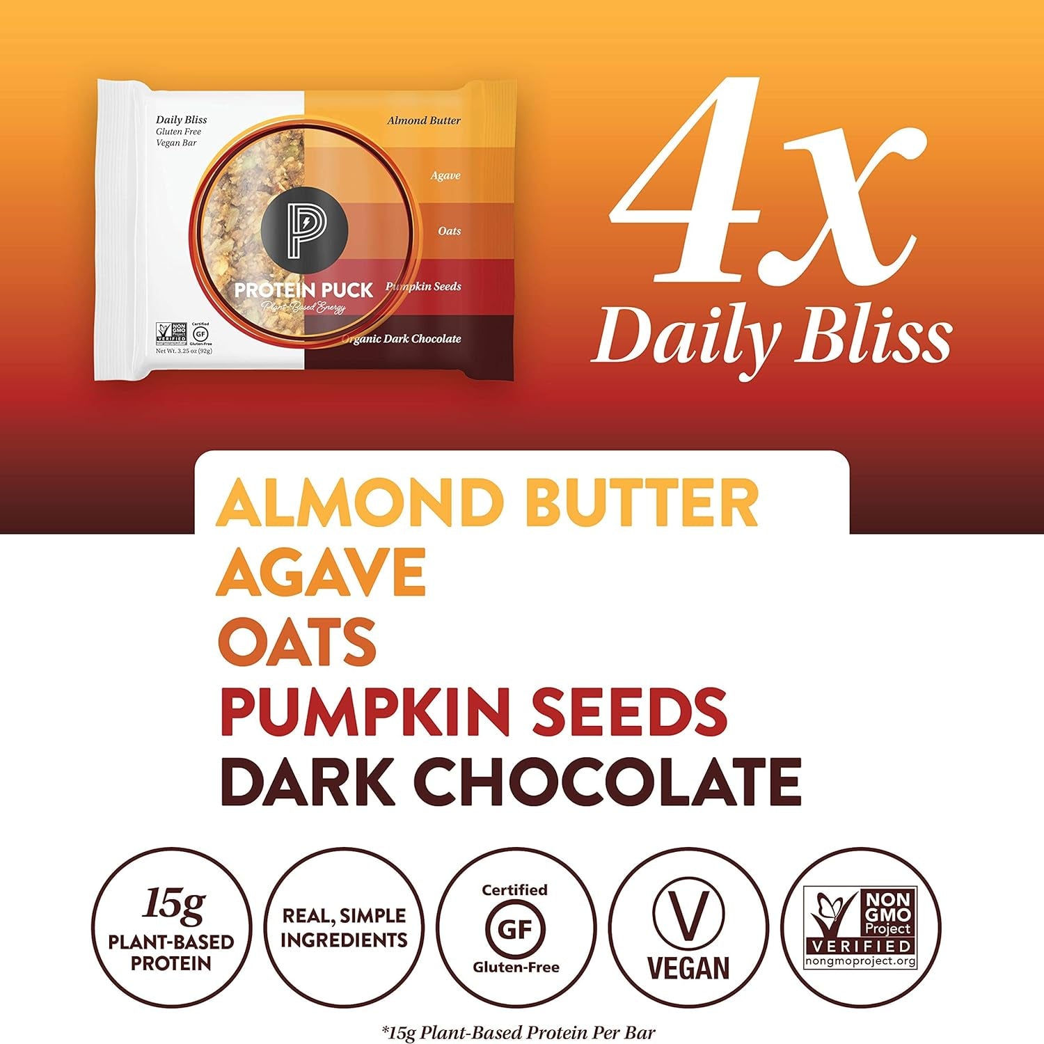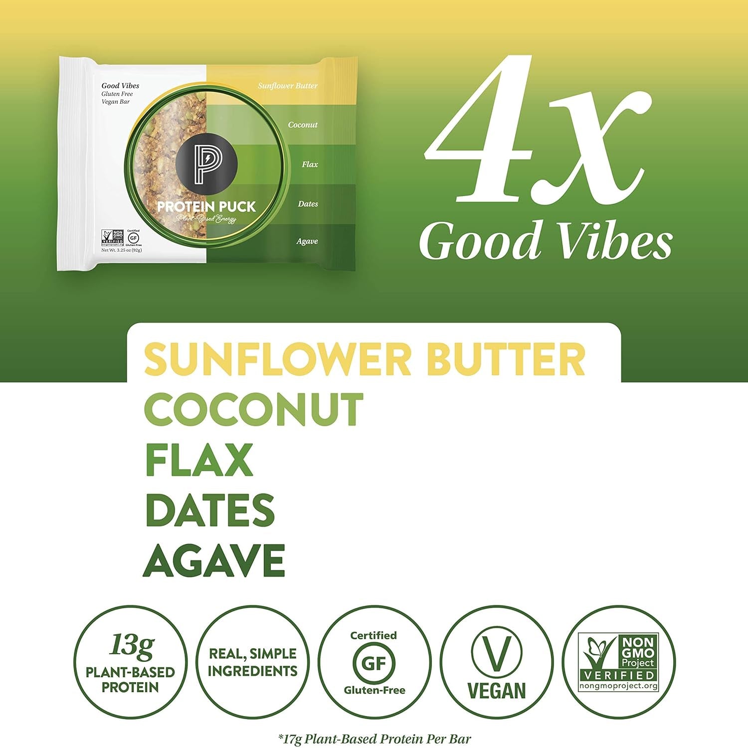 - NOTHING ARTIFICIAL: We formulate our puck protein bars with healthy, natural ingredients. Our plant-based snacks are gluten-free, non-GMO certified, vegan, and Kosher certified. They contain no dairy, soy, or highly-processed protein isolates.