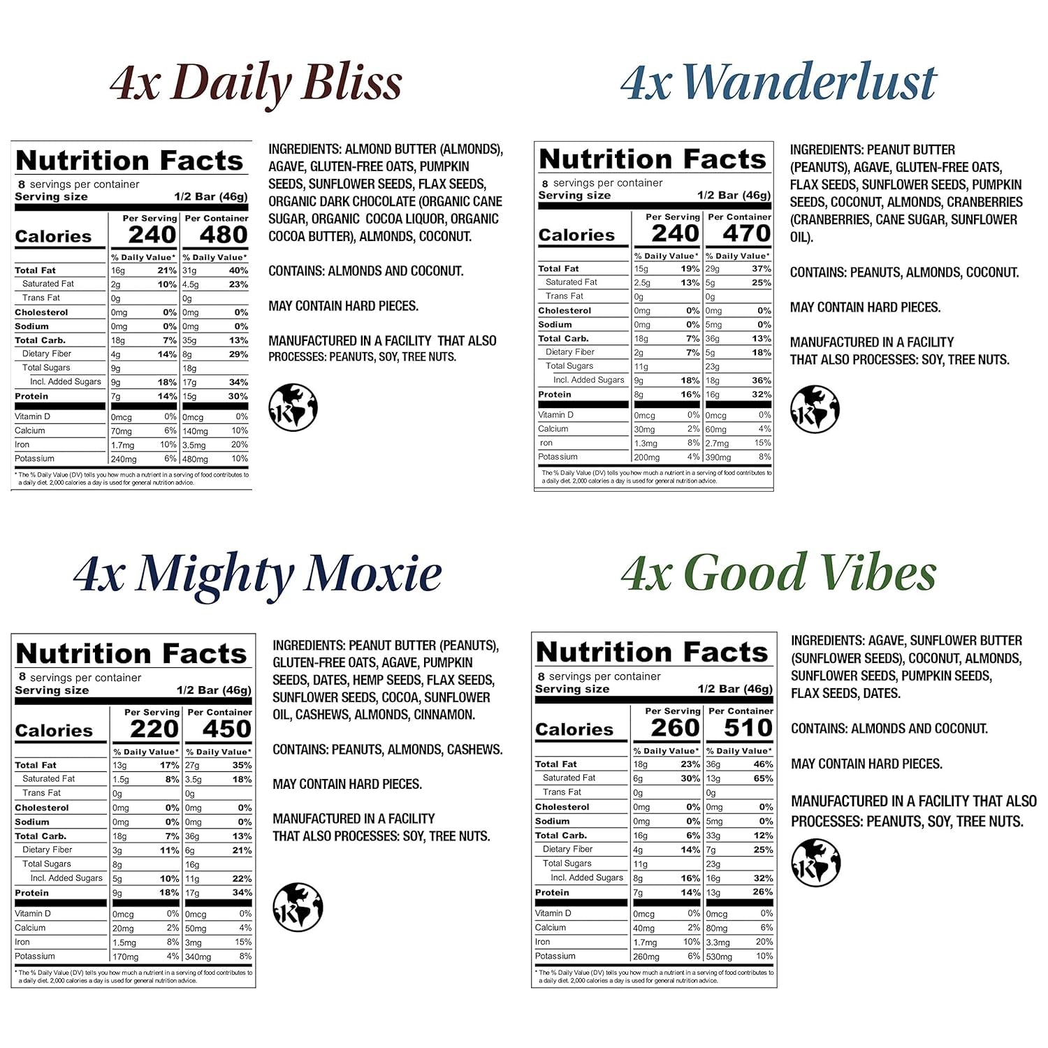 | Flavor Profile | Peanut Butter, Almonds, Oats, Cranberry, Sunflower Seeds | Sunflower Butter, Coconut, Flax, Dates, Agave | Peanut Butter, Cashews, Cocoa, Cinnamon, Hemp Seeds | Peanut Butter, Almonds, Oats, Cranberry, Sunflower Seeds | Almond Butter, Agave, Oats, Pumpkin Seeds, Organic Dark Chocolate | Try all 4 Flavors! |