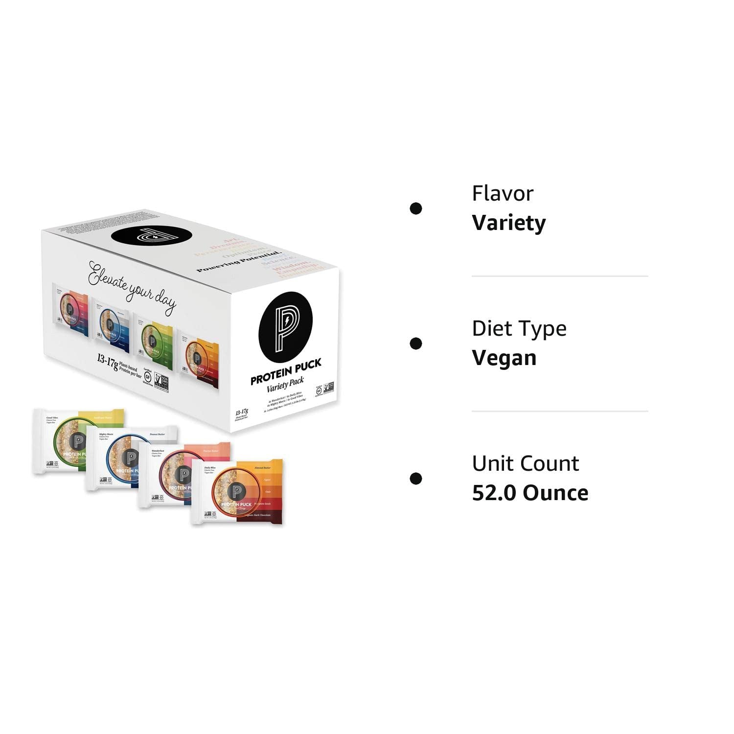 Protein Puck Plant Based Bars | Snacks with 13-17 Grams of Vegan Protein | Gluten Free, Non Dairy, Kosher Certified Non GMO Premium Healthy Bars | Variety, 16 Count (1 Pack) - Variety Pack / 16 Count (Pack Of 1) is backordered and will ship as soon as it is back in stock.