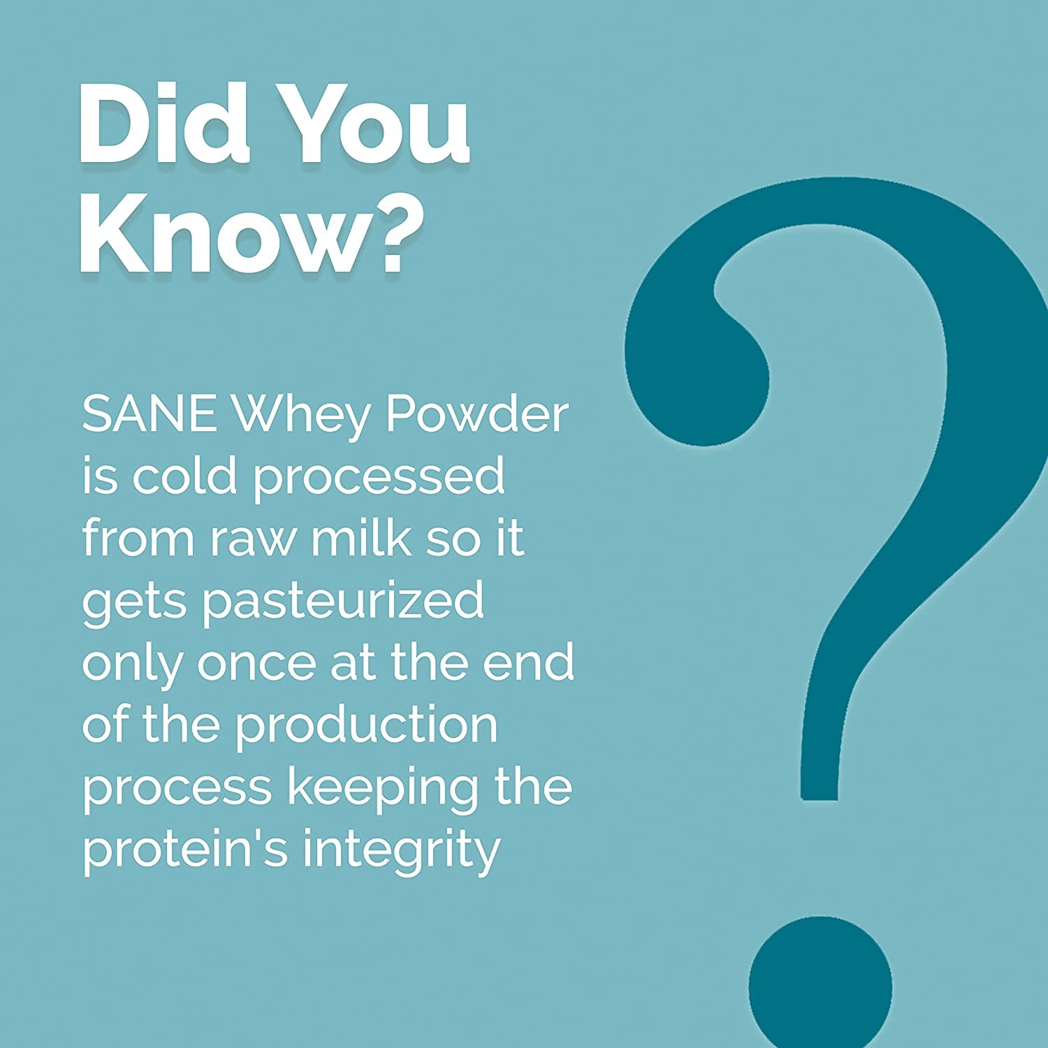 - SANE whey powder is cold processed from raw milk so it gets pasteurized only once at the end of the production process keeping the protein's integrity with very high counts of immunoglobulin, lactoferrin and glycomacropeptides