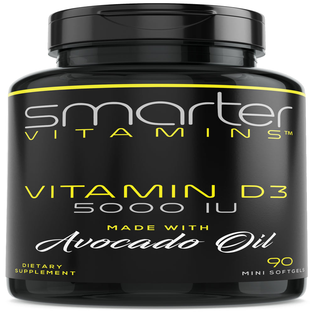 SmarterVitamins Vitamin D3 5000IU made with Extra-Virgin Cold-Pressed Avocado Oil for Optimal Absorption. WHY VITAMIN D WITH AVOCADO OIL: Studies show Vitamin D is better absorbed when taken with fat and avocados have the healthiest fats in the world. We stepped it up and added 100mg of Extra-Virgin Cold-Pressed Avocado Oil sourced from New Zealand. VITAMIN D3 BENEFITS: We use 5000 IU pharmaceutical grade Vitamin D3, the same quality doctor prescribed and recommended. The Vitamin D Council recommends 5000 IU of Vitamin D3 daily for adults to achieve and maintain optimal levels. Vitamin D supports over 3000 cells in your body, bone health, healthy muscle function, immune support and dental & teeth health. NO BOVINE SOFTGELS: We went the EXTRA MILE and made our Vitamin D with Fish Gelatin SoftGels. Other Vitamin D manufacturers make their Vitamin D with Bovine which is beef parts, or worse with porcine which is pig parts. GLUTEN & SOY FREE: SmarterVitamins Vitamin D is free of artificial colors, bovine soft gels, beef, gluten, corn, eggs, milk, wheat, peanut, sugar, starch, sodium, lactose, sweetness, Stearates, preservatives and soy. ACTIVE FORM: Our Vitamin D3 5000IU delivers the same biologically active form of vitamin D produced by the body as a result of sun exposure, without exposure to UVB rays.*