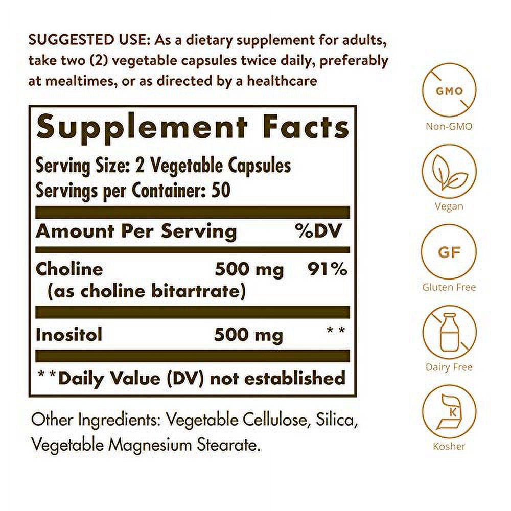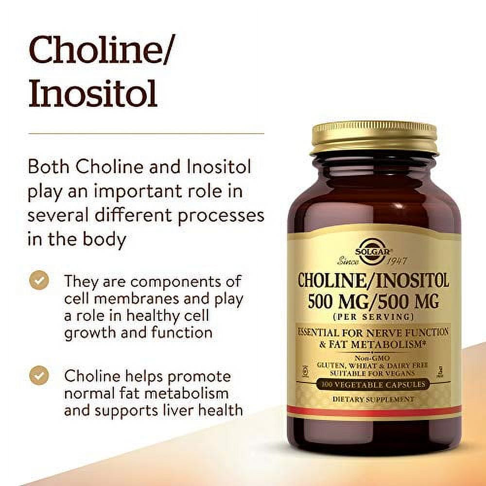 Solgar Choline/Inositol 500 Mg/500 Mg, 100 Vegetable Capsules - Energy Metabolism, Liver Health, Essential for Brain & Nerve Function - Non-Gmo, Vegan, Gluten Free, Dairy Free, Kosher - 50 Servings