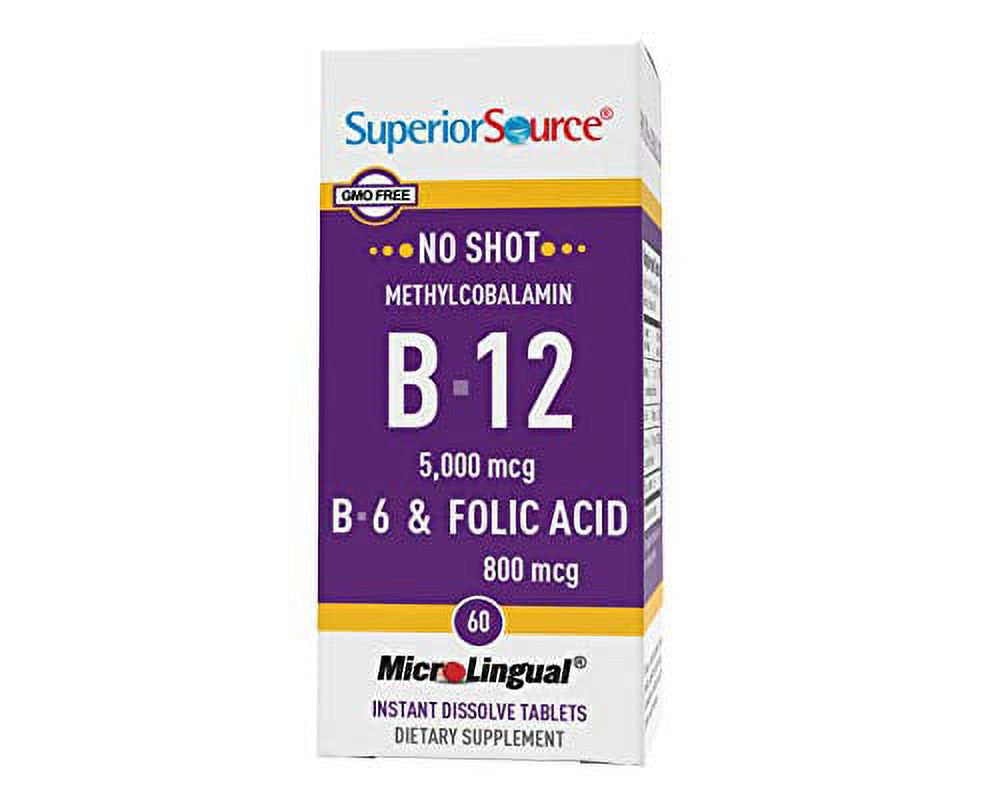 Superior Source No Shot Vitamin B12 Methylcobalamin (5000 Mcg), B6, Folic Acid, Quick Dissolve Sublingual Tablets, 60 Ct, Increase Energy, Healthy Heart, Boost Metabolism, Stress Support, Non-Gmo