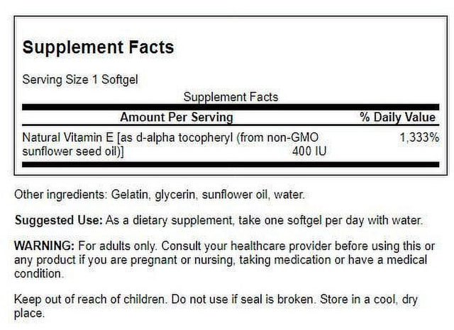 Natural Vitamin E [as d-alpha tocopheryl 400 IU 1,333%,Other ingredients: Gelatin, glycerin, sunflower oil, water.,As a dietary supplement, take one softgel per day with water./div>