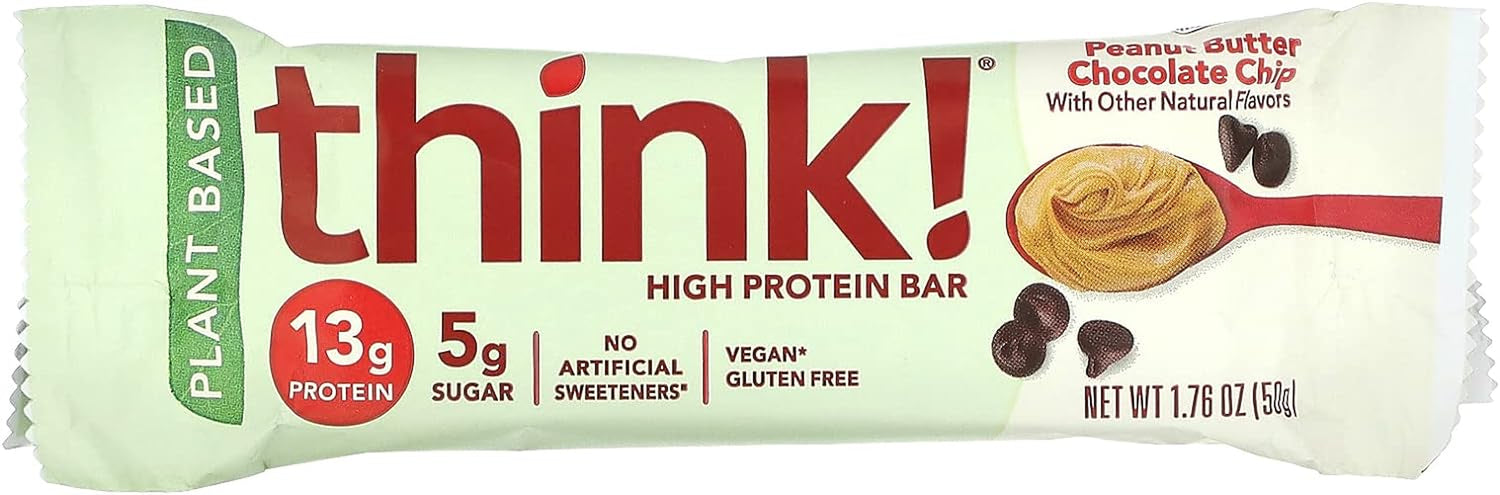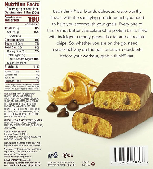 Think! Vegan/Plant Based High Protein Bars - Peanut Butter Chocolate Chip, 13G Protein, 5G Sugar, No Artificial Sweeteners, Non GMO Project Verified, 10 Count (Packaging May Vary)