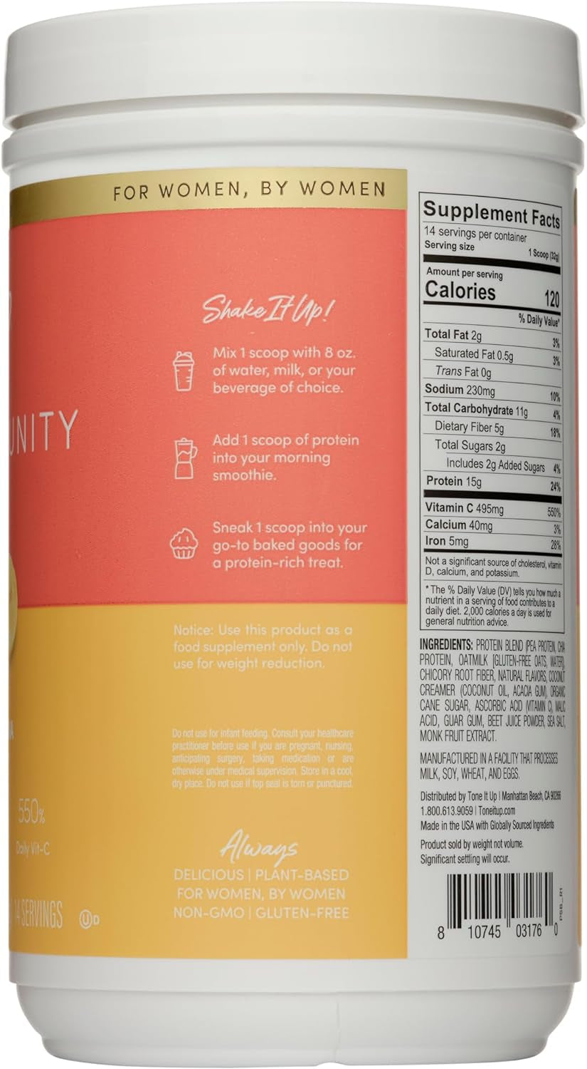 Enjoy your favorite plant-based protein with a deliciously smooth strawberry banana immunity boost. Created by women just for you, each serving of Tone It Up’s Protein + Immunity delivers 550% daily recommend value of Vitamin C plus 15 right-sized grams of plant-based protein to help you support immunity, stay satisfied and reach your goals. We combined pea & chia proteins with oat milk to create a smooth and creamy blend that is perfect for kickstarting your day, post workout smoothies and even baking.