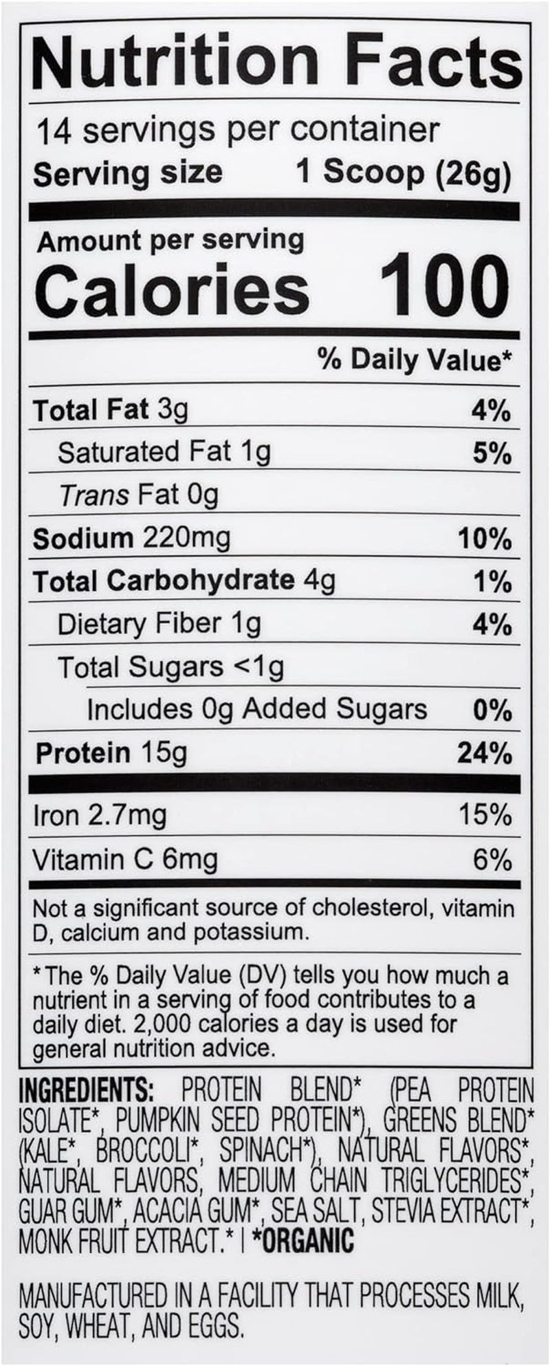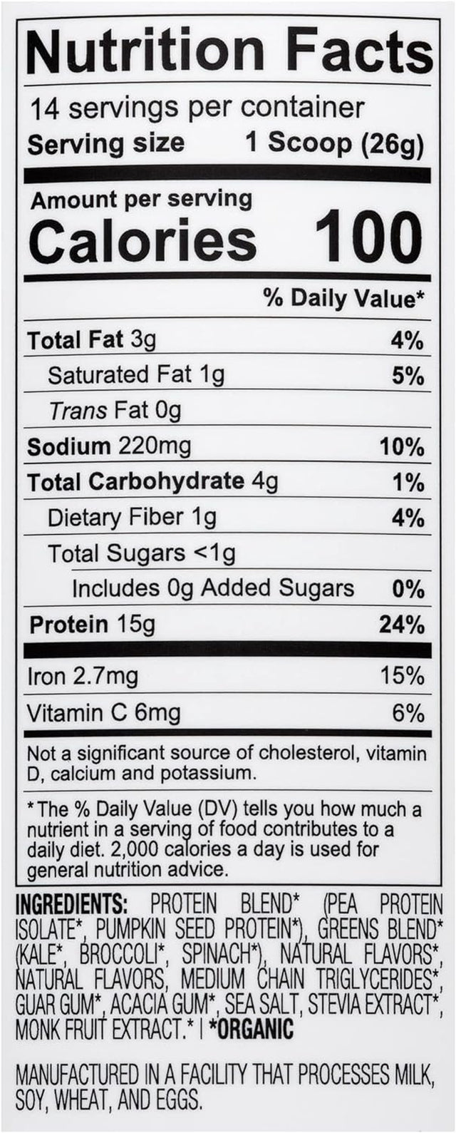 - NO ARTIFICIAL INGREDIENTS: We combined pea and chia seed proteins with natural vanilla flavor to create a smooth and creamy blend that is gluten free, dairy free, kosher, non-GMO, and 100% delicious. Each serving contains 14 leaves of kale, 4 leaves of spinach and a floret of broccoli.
