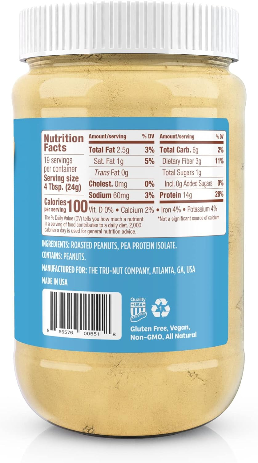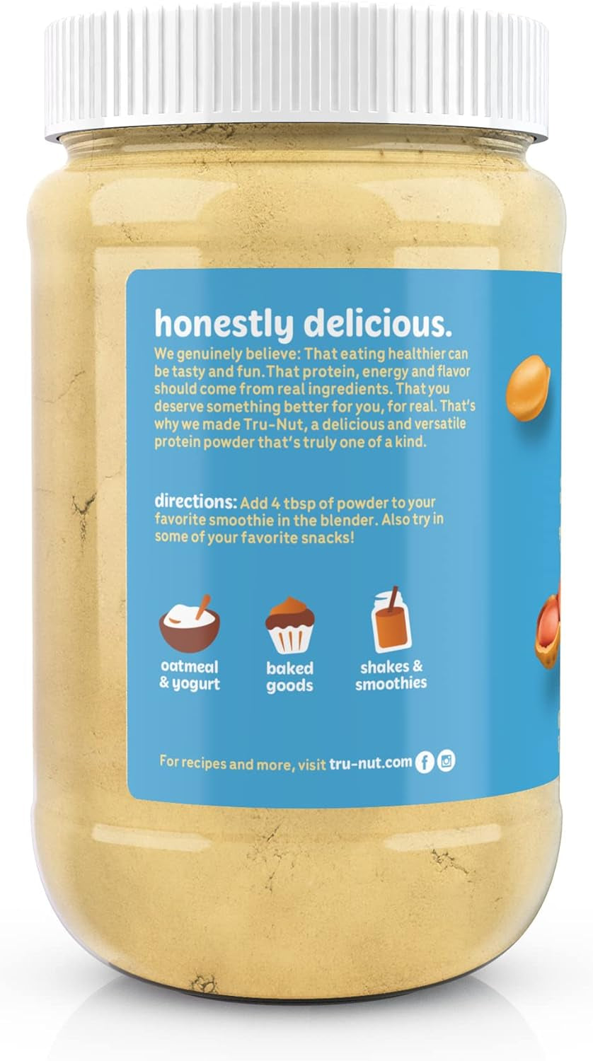 USA GrownWe start with high oleic roasted peanuts grown by American farmers. We add high quality pea protein from US-grown peas to boost the protein content without affecting the blend’s great taste. | Boost Your Energy NaturallyGive yourself that boost of energy to start the day, motivate yourself to start your workout routine, and feel energized and focused with a healthy, delicious protein shake. | Healthy, Natural Peanut FlavorTru-Nut Peanut Protein Powder is gluten-free, all-natural, non-GMO, and vegan. We use no preservatives, flavorings, sweeteners, or palm oil in this product. |
