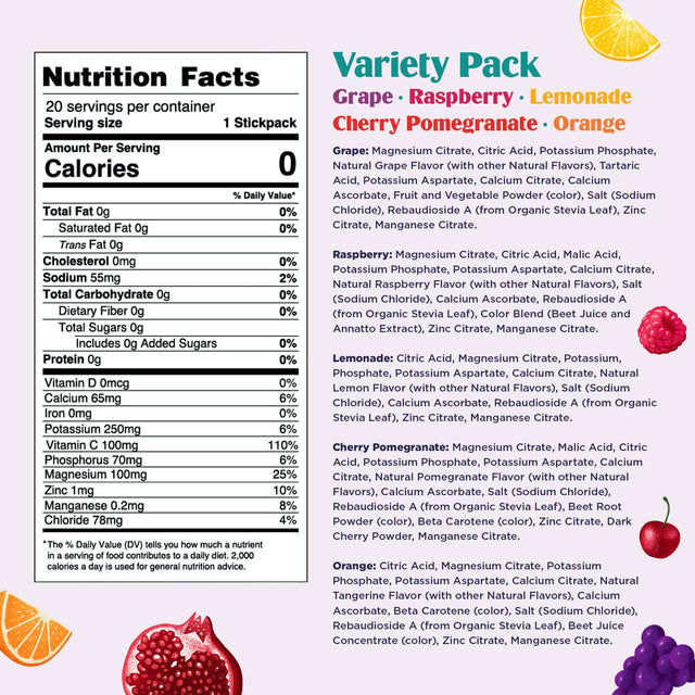 - NATURAL TASTE WITHOUT THE SUGAR: Adding electrolyte powder provides enhanced hydration without the sugar, carbs, and calories. Naturally sweetened with organic stevia leaf and infused with real fruit flavors. Contains important minerals like Magnesium, Calcium, and Potassium. Plant based flavors and colors- Vegan, gluten free, caffeine free, soy/dairy free, keto friendly, paleo-friendly, Non-GMO. We don't use any artificial sweeteners like erythritol, sucralose, saccharin, or aspartame.