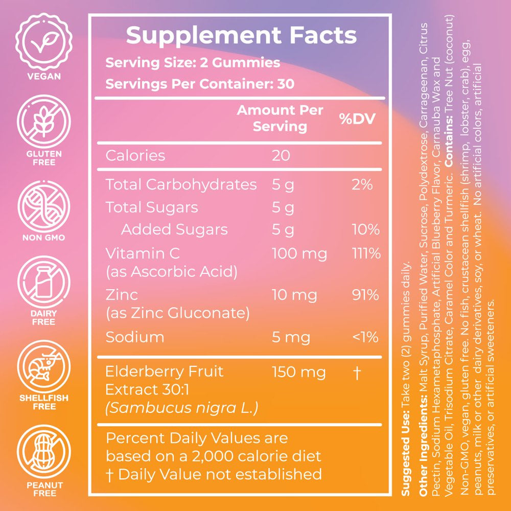 Immunity Support Gummies: Our elderberry gummies feature high-strength elderberry, combined with the added health benefits of vitamin c and zinc. These immune support gummies are carefully crafted with a combination of vitamins, minerals, and antioxidants making these elderberry immunity gummies an effective and comprehensive supplement. Kids Elderberry gummies have also been known to support the health of the respiratory system.