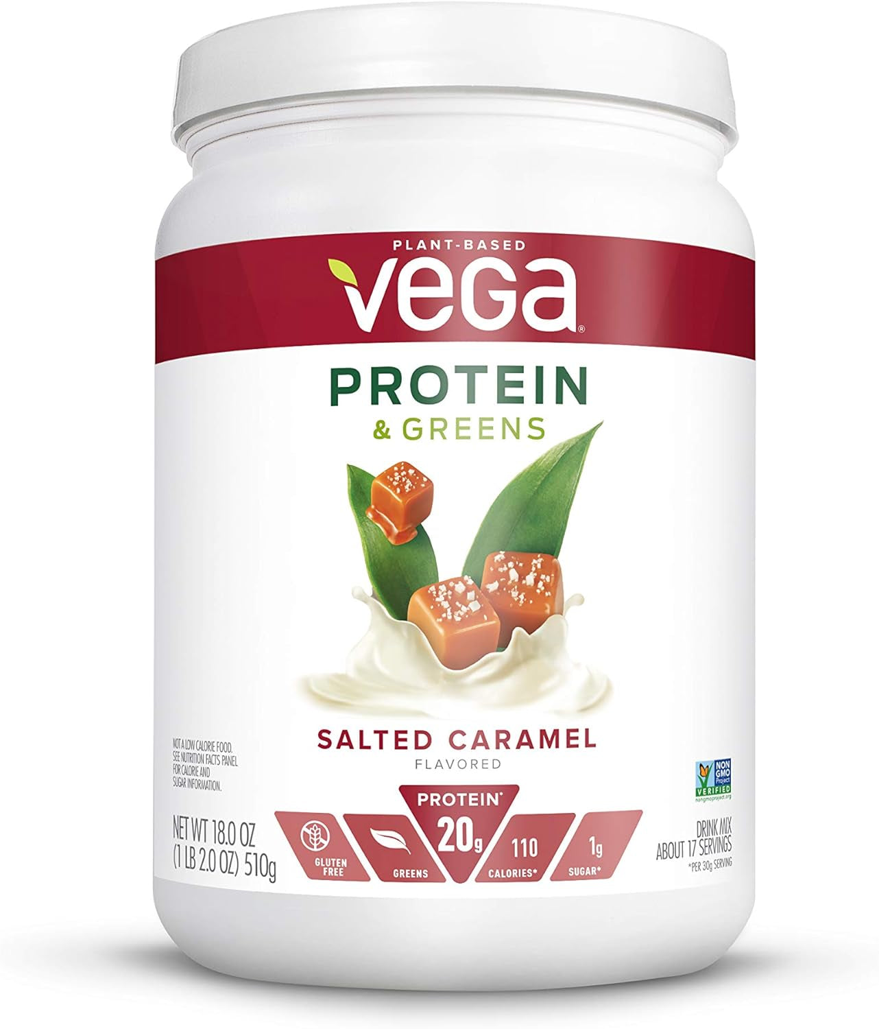 Looking for more than just protein powder? Deliciously smooth, Vega Protein & Greens helps add effortless nutrition with 20 grams of vegetable protein plus real, plant-based food ingredients like spinach and kale. Vega caramel flavored protein powder contains all nine essential amino acids from vegan pea protein, brown rice protein and sacha inchi protein. Start your day with plants by shaking up one serving of Vega Protein & Greens with 1 ½ cups of of ice water or blend a scoop into your favorite smoothie recipe for a smooth, subtly sweet taste. Vega Protein & Greens is non-GMO Project Verified, vegetarian, vegan certified, low-glycemic, gluten-free, and without dairy or soy ingredients. Try Vega Protein & Greens in delicious Vanilla, Chocolate, Salted Caramel, Berry, Coconut Almond, Tropical or Plain Unsweetened. This product is keto-friendly. We recommend adding coconut oil to your favorite smoothie or shake for a little extra fat. Not a medical food.