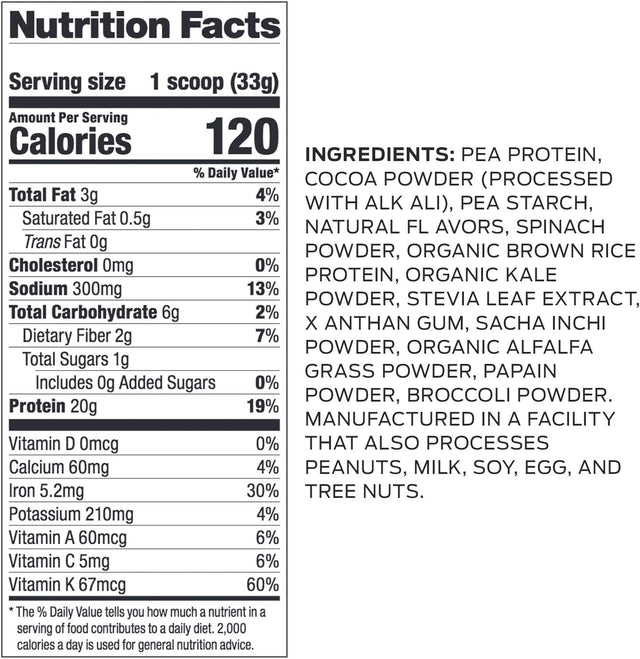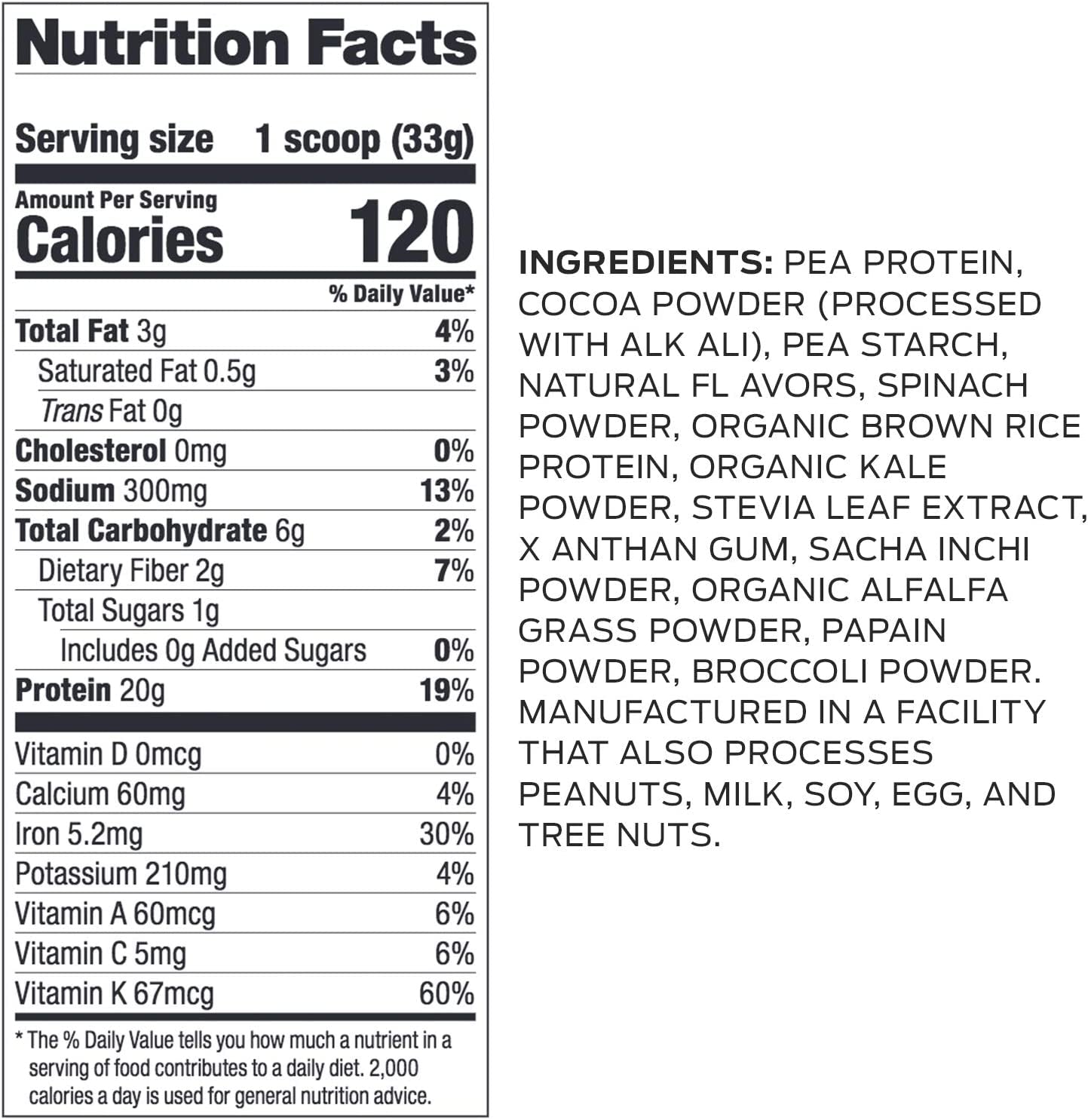 Looking for more than just protein powder? Deliciously smooth, Vega Protein & Greens helps add effortless nutrition with 20 grams of vegetable protein plus real, plant-based food ingredients like spinach and kale. Vega chocolate protein powder contains all nine essential amino acids from vegan pea protein, brown rice protein and sacha inchi protein. Start your day with plants by shaking up one serving of Vega Protein & Greens with 1 ½ cups of of ice water or blend a scoop into your favorite smoothie recipe for a smooth, subtly sweet taste. Vega Protein & Greens is non-GMO Project Verified, vegetarian, vegan certified, low-glycemic, gluten-free, and without dairy or soy ingredients. Try Vega Protein & Greens in delicious Vanilla, Chocolate, Salted Caramel, Berry, Coconut Almond, Tropical or Plain Unsweetened. This product is keto-friendly. We recommend adding coconut oil to your favorite smoothie or shake for a little extra fat. Not a medical food.