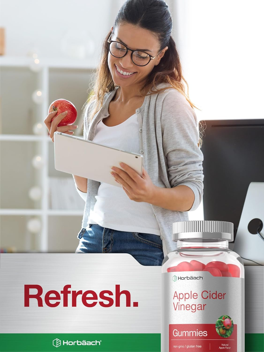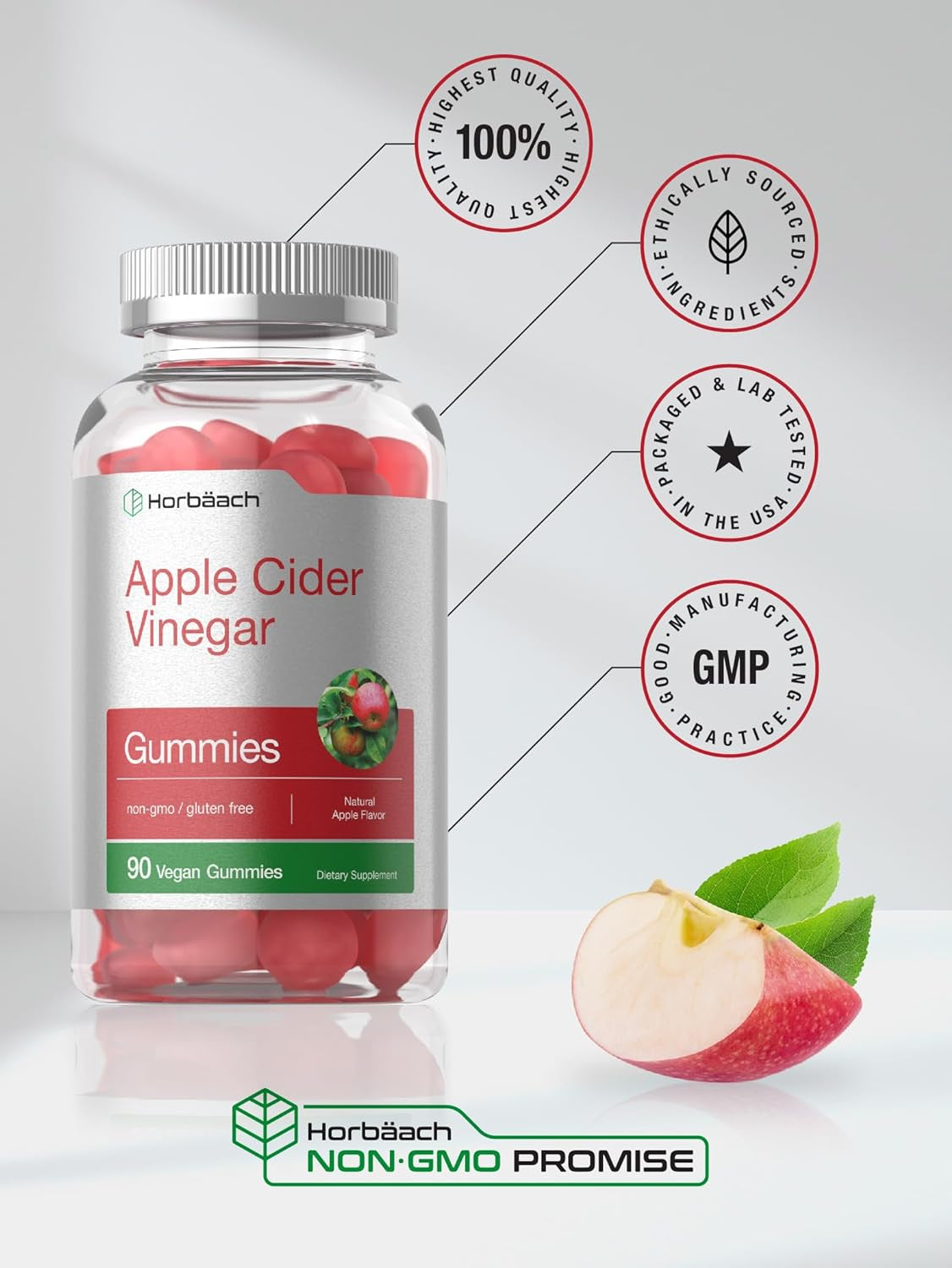 What is Apple Cider Vinegar?Apple Cider Vinegar is a substance produced through the fermentation of crushed apples into alcohol. It has been a part of health & wellness traditions for centuries due to its high concentration of beneficial acetic acid. | How to get Apple Cider Vinegar:Pills, tablets, liquid, tablets, bulk powder and capsules are a few common products that have become popular. Now you also have the option to supplement with our natural apple-flavored gummies! | Horbaach's Apple Cider Vinegar Gummies:Our expertly designed vegan formula provides 600 mg per serving in Gluten-Free and Non-GMO gummies. They're naturally free of artificial flavor and artificial sweetener and are an easy addition to any routine. |