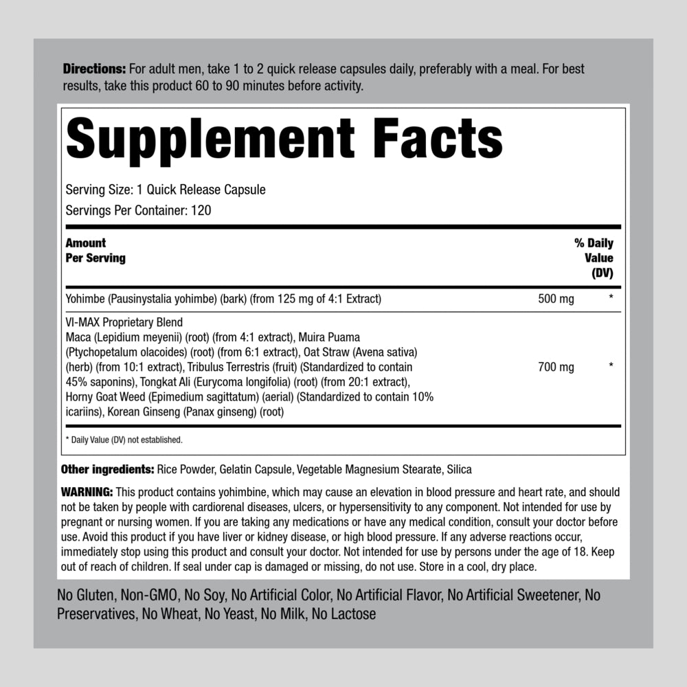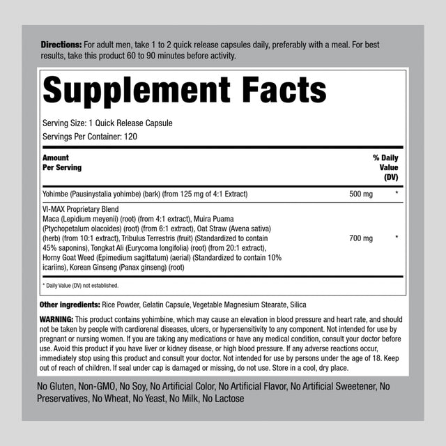 Our Vi-Max formula is Non-GMO and free of Gluten, Soy, Artificial Color, Artificial Flavor, Artificial Sweetener, Preservatives, Wheat, Yeast and Lactose. Add this strong blend to your herbal collection or pop it in your bag for long-lasting support on-the-go. Take things up a notch today with PipingRock’s Men’s Health classic!
