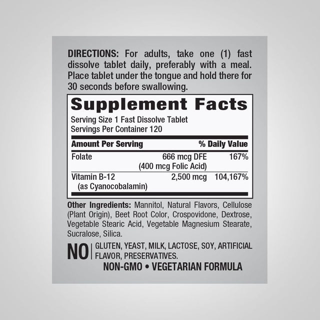 Vitamin B12 2500 Mcg | 120 Fast Dissolve Tablets | Natural Berry Flavor | with Folic Acid | Vegetarian, Non-Gmo, Gluten Free Supplement | by Piping Rock