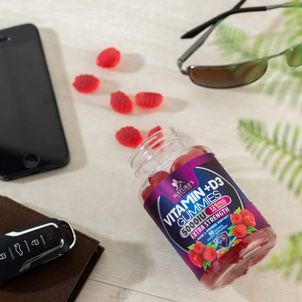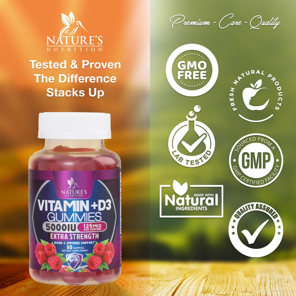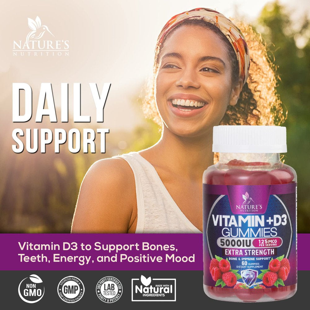 Vitamin D3 Gummies 5,000 IU Extra Strength 125 mcg D3 Supplement Gummy - Support Natural Bone, Muscle, & Immune Health - Gluten Fee - Non-GMO - Nature's Raspberry Flavor - 60 Gummies - 60 Day Supply