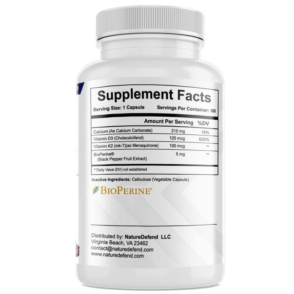 K2 + D3 provides just the right amount of each essential vitamin to maximize their benefits to your bones and heart. Vitamin D (specifically D3, the form of Vit D you get from the sun) is essential to for properly absorbing the calcium we all know is so important as we age. Most people start taking Vitamin D3 after they experience signs of deficiency. You may have heard that D3 shouldn't be taken alone- and it's true; while Vitamin D ensures that calcium is absorbed, Vitamin K2 (specifically as MK-7, the most bioavailable form) directs it to areas of your body such as your bones, so it can be put to good use. Without K2, the calcium absorbed may be deposited in the arteries, where it can lead to calcification or other issues. Bottom line, Vitamins K2 & D3 are truly the perfect pair. If you're serious about supporting healthy bones, experience the benefits of NatureDefend's K2 + D3!