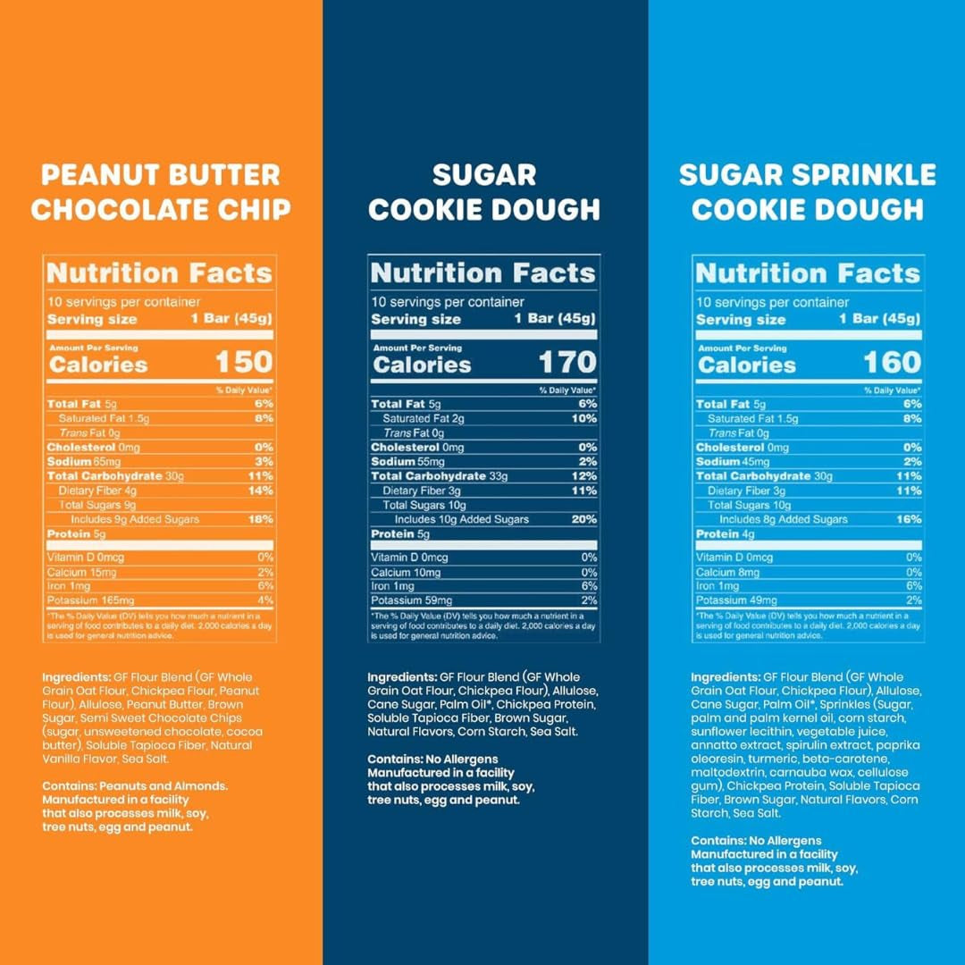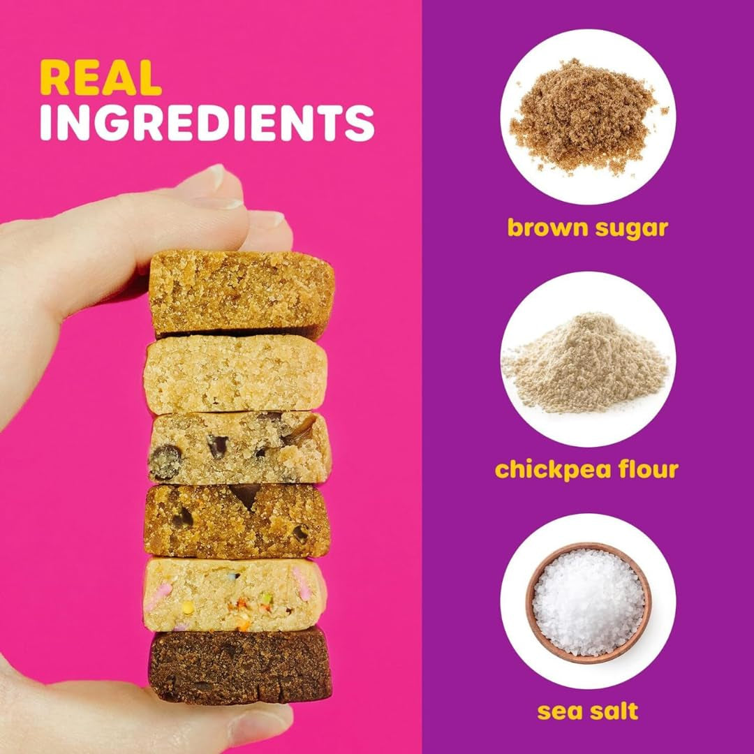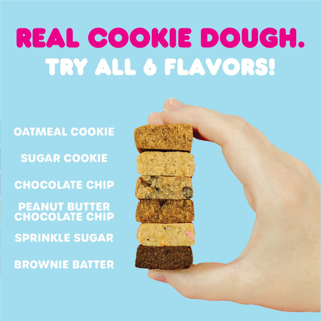 - Cookie Dough Indulgence - Try our variety pack of cookie dough bar snacks : Chocolate Chip, Sugar Cookie, Sprinkle Sugar, Oatmeal, Peanut Butter Chocolate Chip, and Brownie Batter.