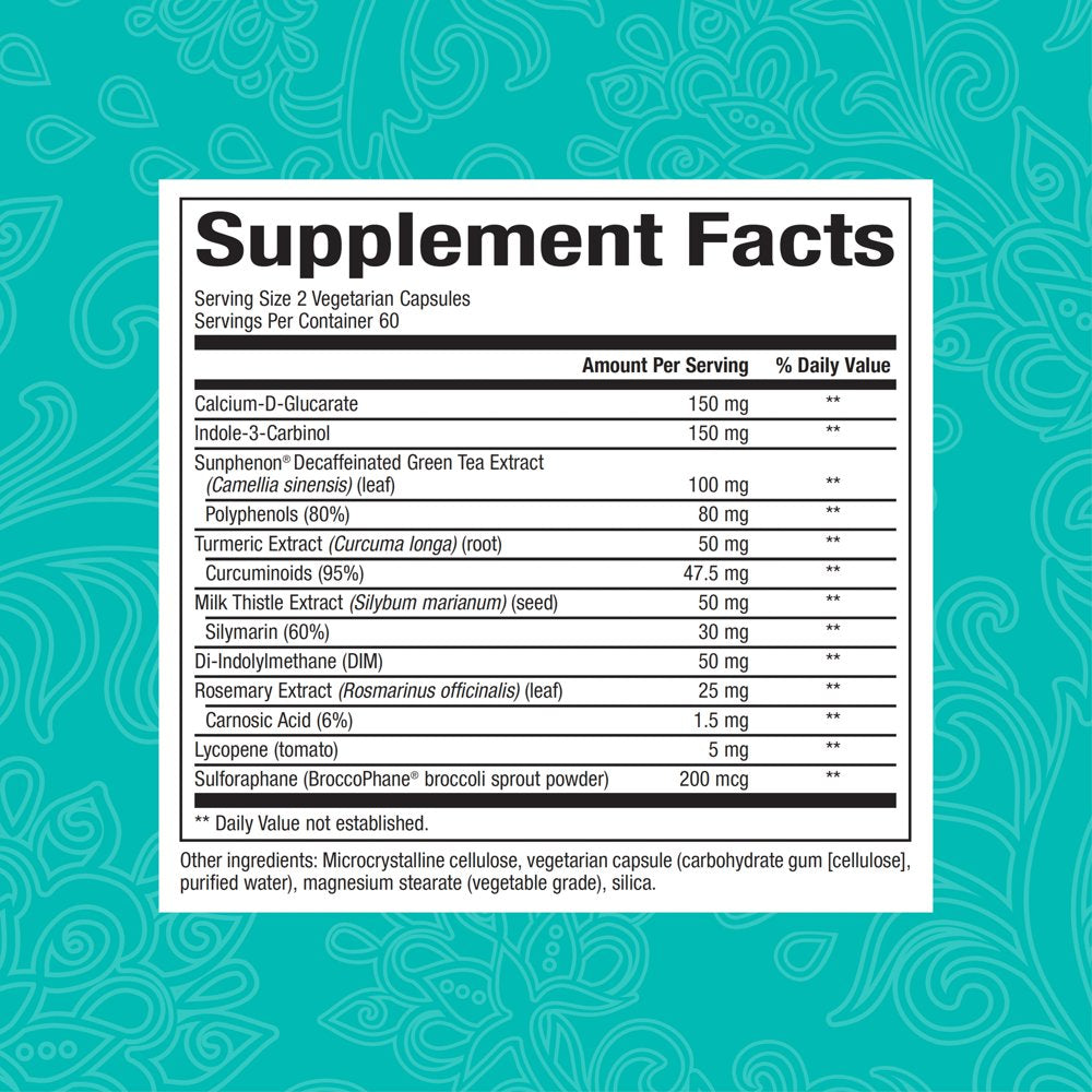 - Naturally supportive blend: Crafted with calcium-D-glucarate, indole-3-carbinol, green tea, turmeric and rosemary as well as milk thistle seed, lycopene and sulforaphane