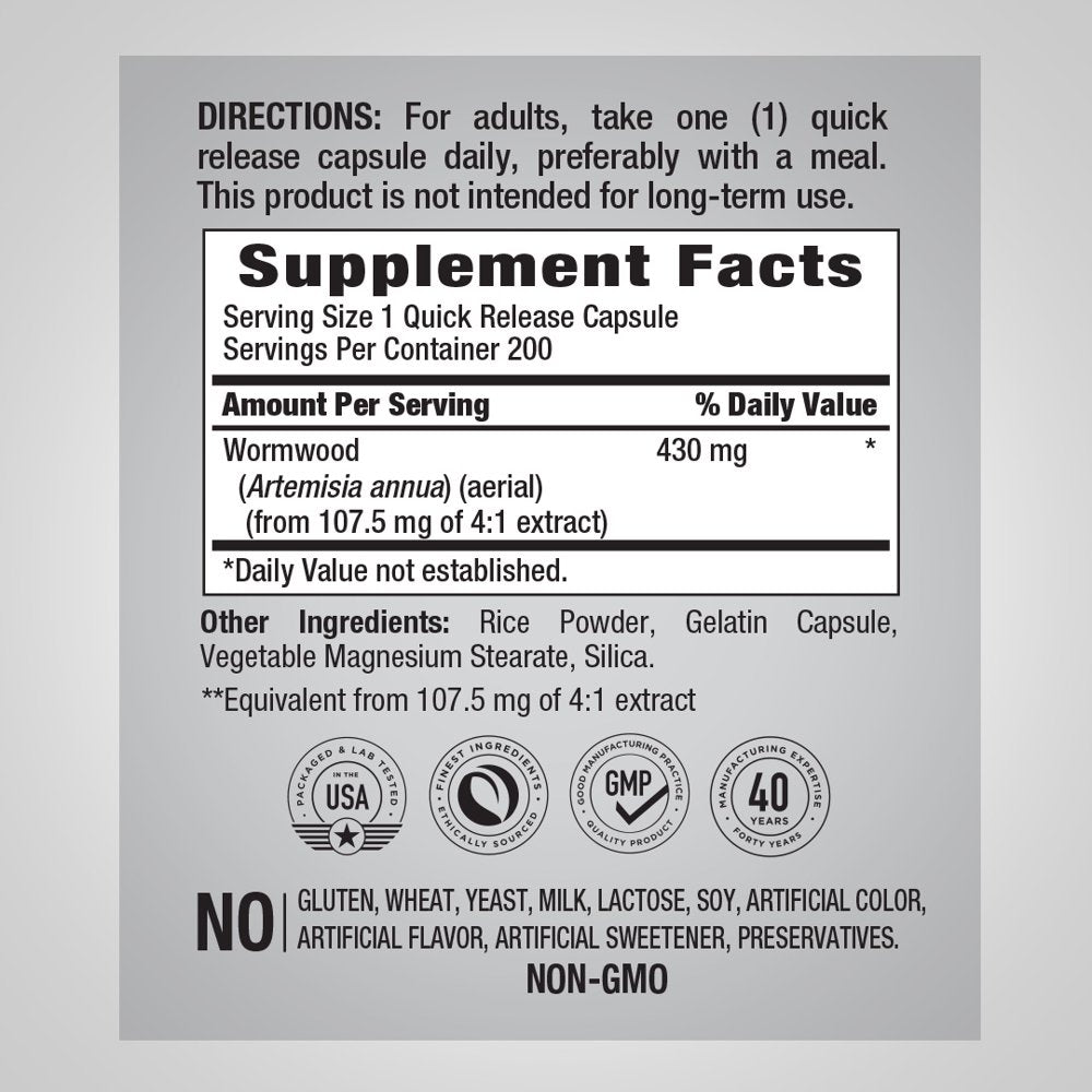 Wormwood Capsules 430Mg | 200 Count | Concentrated Herbal Extract | Artemisinin Supplement | Non-Gmo, Gluten Free | by Piping Rock