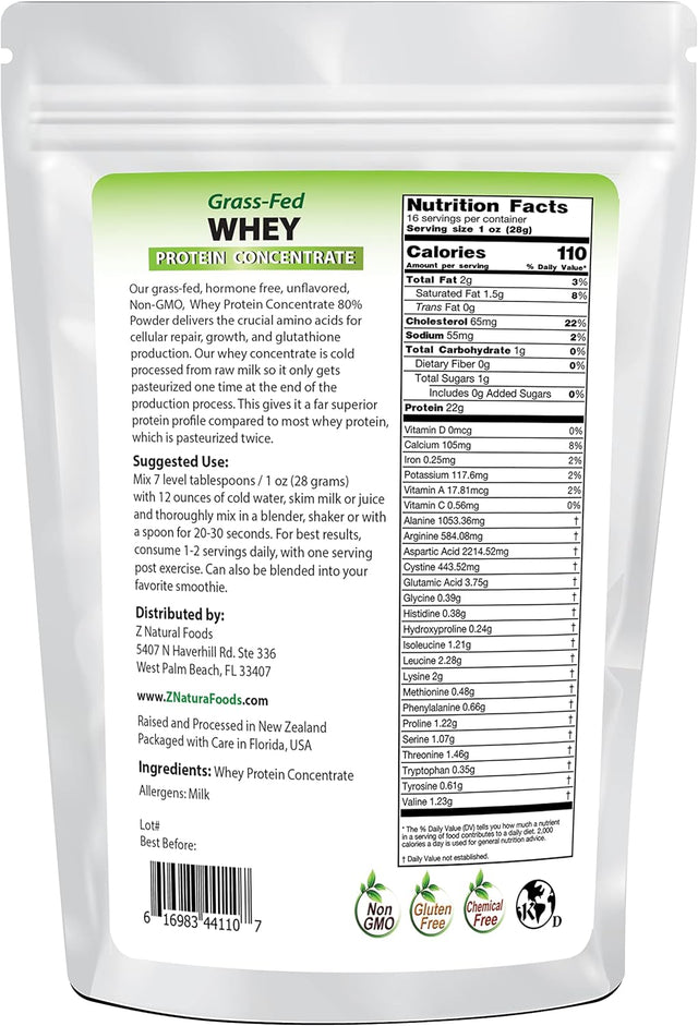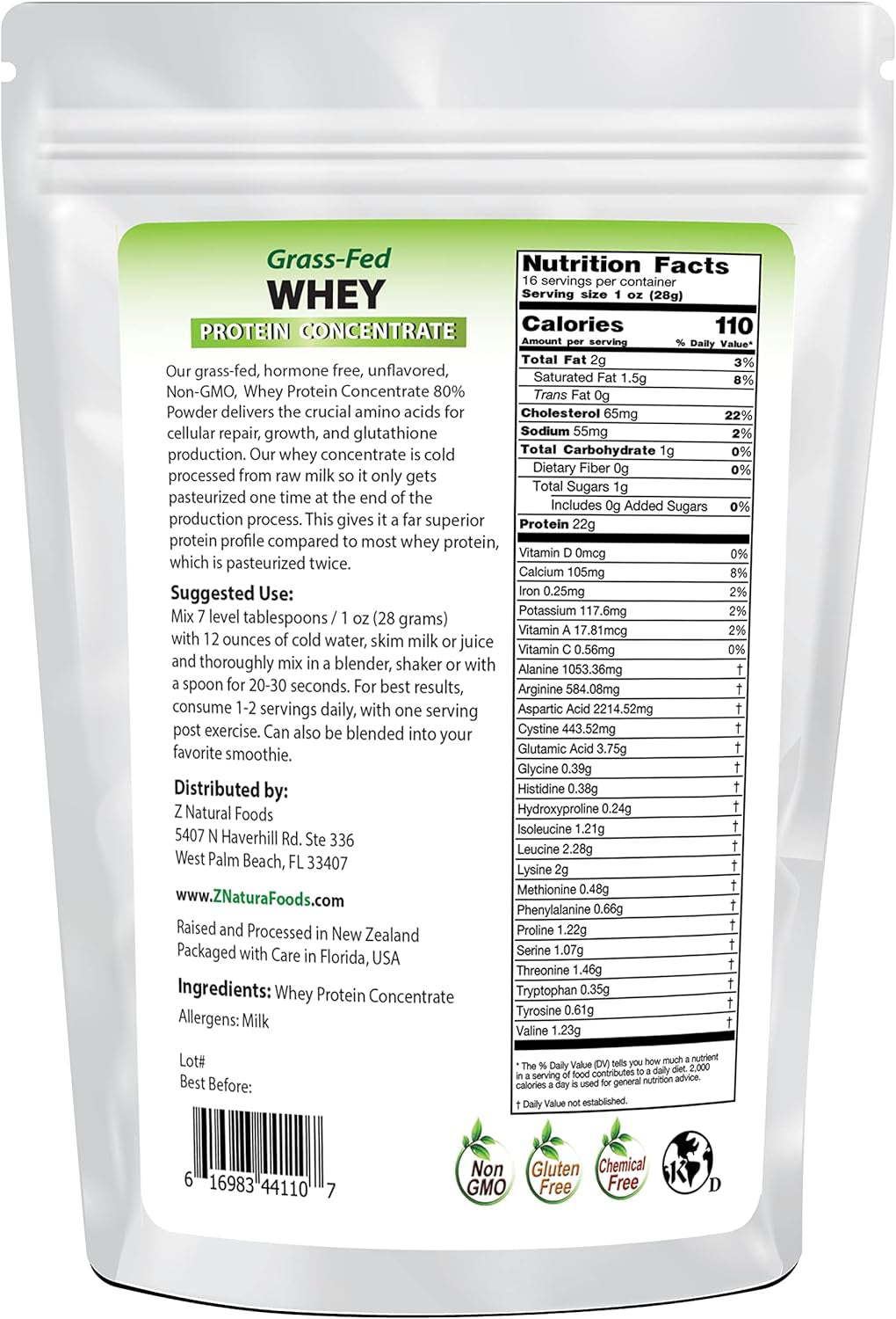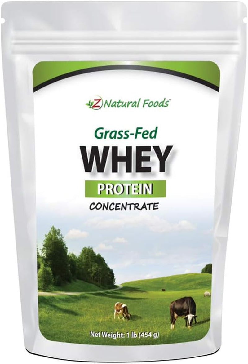 Z Natural Foods Grass-Fed Whey Protein Powder from New Zealand, Unflavoured and Undenatured Protein Powder Enriched with Vital Proteins, 100% Pure, Gluten-Free, Non-Gmo, Kosher, 1 Lb.