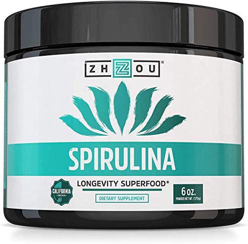 Zhou Spirulina Powder, Nutrient Rich Superfood, California Grown, 100% Pure, Vegan, Gluten Free, Non-Gmo, Non-Irradiated, Perfect for Smoothies, Juices, 48 Servings, 6 Oz