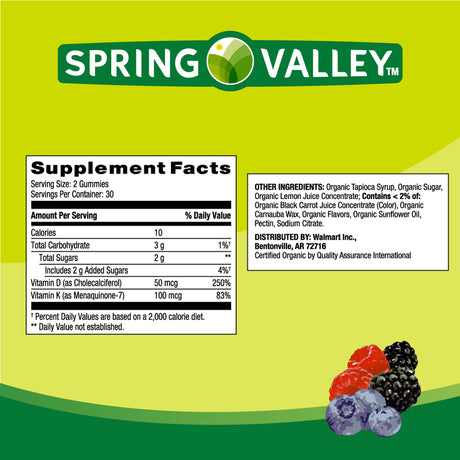 Spring Valley Non GMO K2 and D3 Vegetarian Gummies, Mixed Berry, 50 Mcg (2000 IU), 60 Count