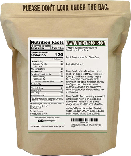 Anthony'S Organic Hemp Seed Protein, 1 Lb, Cold Pressed, Gluten Free, Non GMO, Fine Powder