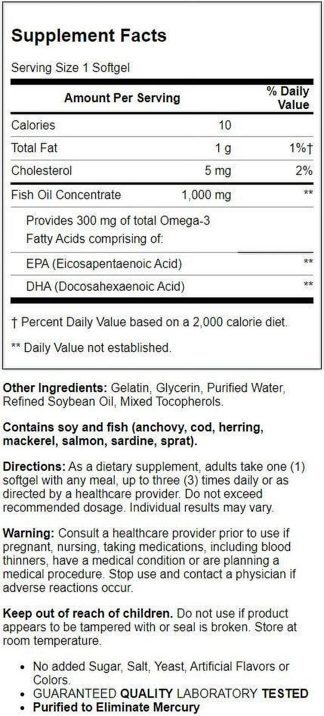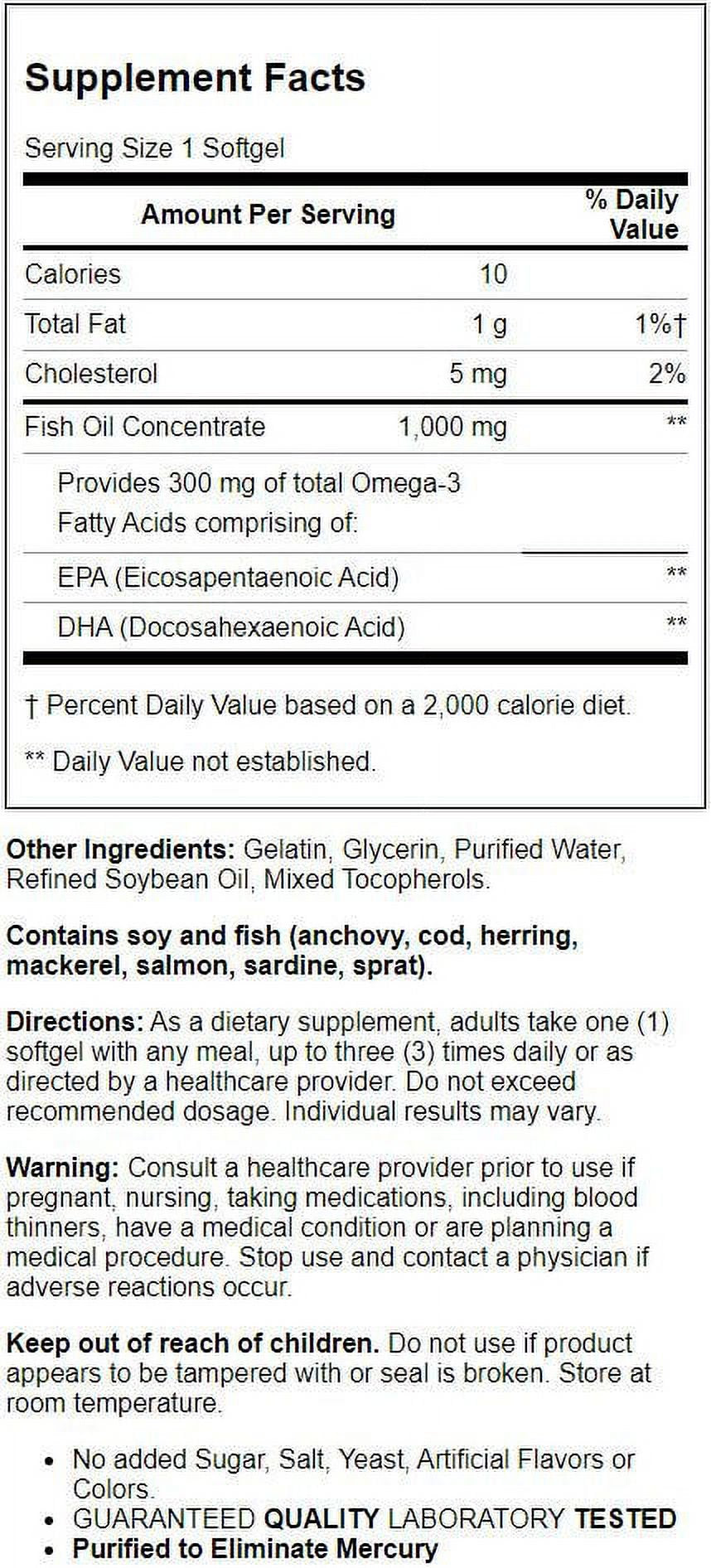 Fish Oil, 1000 mg, Omega-3, Softgels, Bottle 120 CT Dietary Supplement. Omega-3. Rich source of EPA & DHA. May reduce the risk of coronary heart disease (see side panel) [Supportive but not conclusive research shows that consumption of EPA and DHA omega-3 fatty acids may reduce the risk of coronary heart disease. One serving of 21st Century Fish Oil 1000 mg provides 300 mg of EPA and DHA, and other omega-3 fatty acids (see supplements facts for total fat and saturated fat content). 21st Century Fish Oil contains high quality molecularly distilled fish oil concentrate]. Purified to eliminate mercury, PCBs & dioxins. No added sugar, salt, yeast, preservatives, artificial flavors or colors. www.21stcenturyvitamins.com. Guaranteed quality. Laboratory tested. Take up to three (3) softgels daily with any meal for maximum results, or as directed by your healthcare provider. Do not exceed recommended dosage. Store at room temperature. Contains soy and fish (herring, anchovy, mackerel, sardine, sprat and salmon) ingredients. Before using this product, consult your healthcare provider if you are: pregnant or nursing, have a medical condition, taking and medications, or are planning any medical procedures. If any adverse reactions occur, discontinue use and consult your healthcare provider. Keep out of reach of children. Do not use if product appears to be tampered with or seal is broken. 120 softgels 2119 S. Wilson Street Tempe, AZ 85282