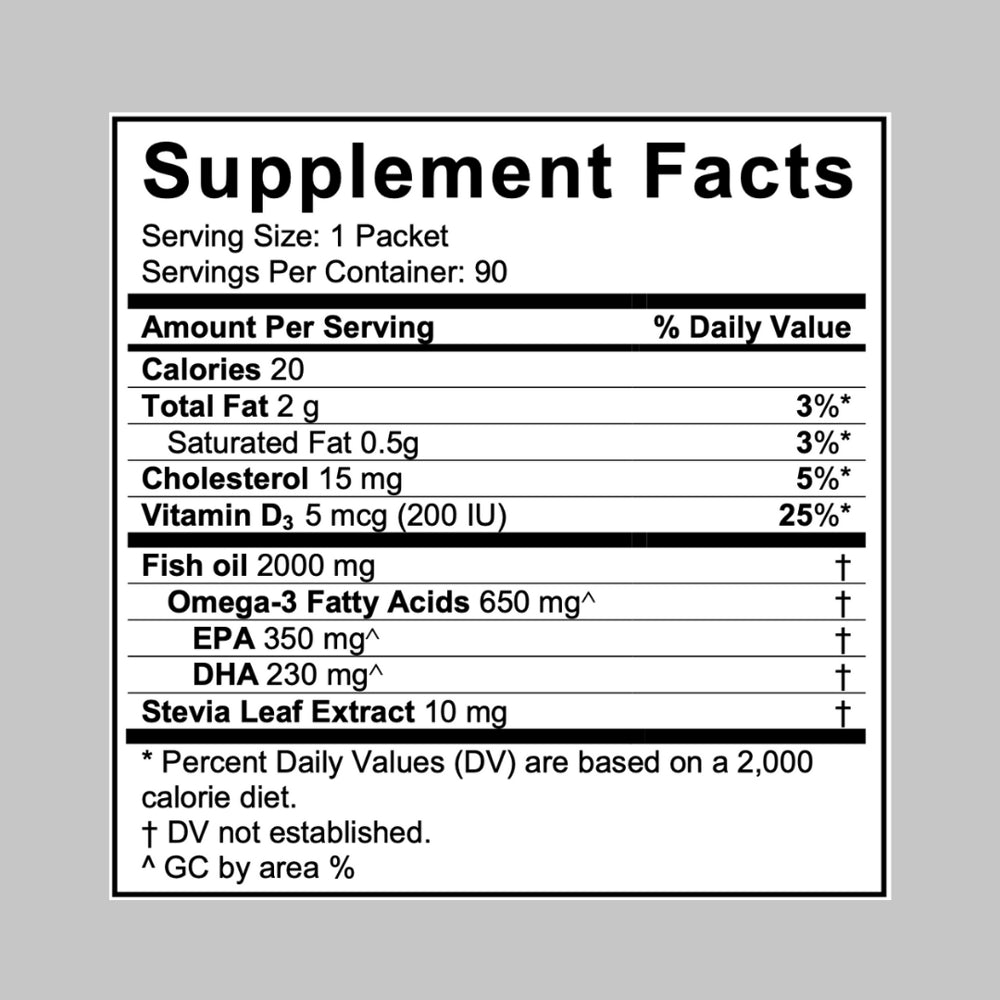 Fish oil, water, pasteurized egg yolk, ascorbic acid, natural flavors, stevia leaf extract, vegetable oil, sodium ascorbate, mixed natural tocopherols, citric acid, potassium sorbate, sodium benzoate, beta carotene (for color), xanthan gum, menthol, cholecalciferol.Contains egg and fish (anchovy, sardine, mackerel: may contain other species). Manufactured in a facility which processes milk.Does not contain sugar, artificial sweeteners, dairy, yeast, wheat or gluten./div>