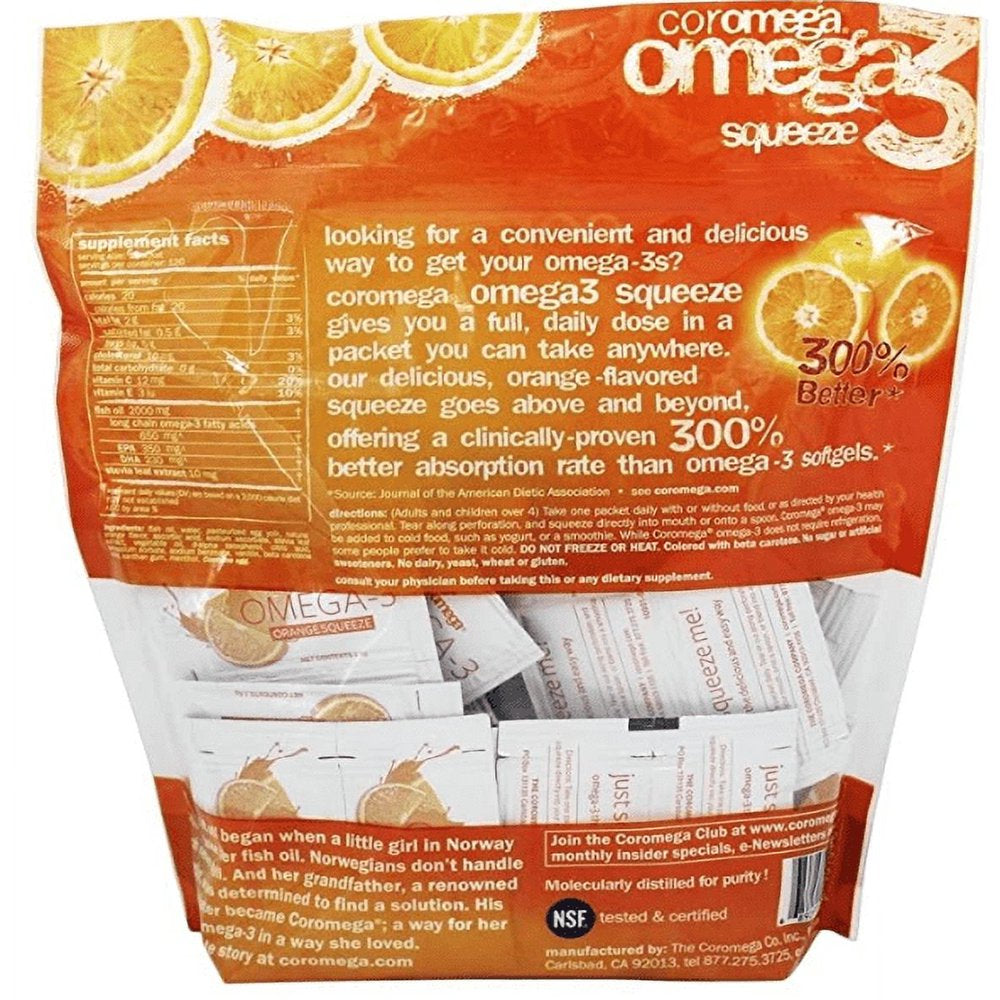 Coromega Omega-3 Orange Squeeze is a creamy, delicious way to get your daily dose of omega-3. Each squeeze packet contains 650 mg of omega-3 and it's emulsified for 300% better absorption. Convenient daily-dose squeeze packet - just tear and squeeze into your mouth or onto a spoon. No refrigeration required. Contains no sugar, artificial sweeteners, dairy or gluten.