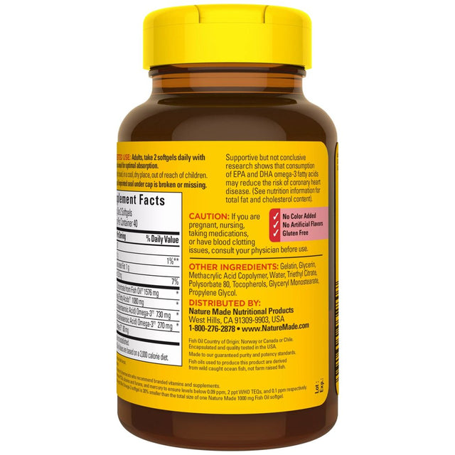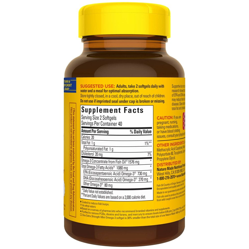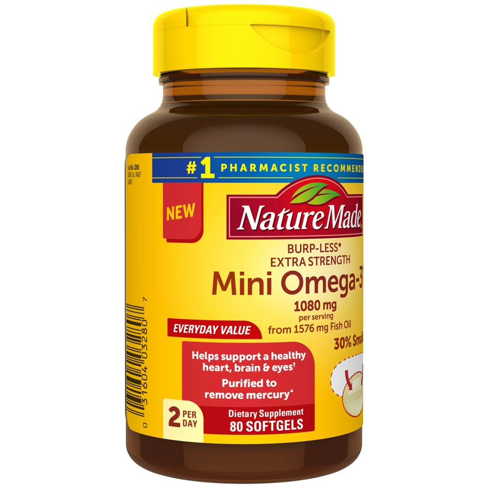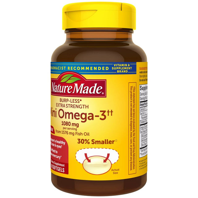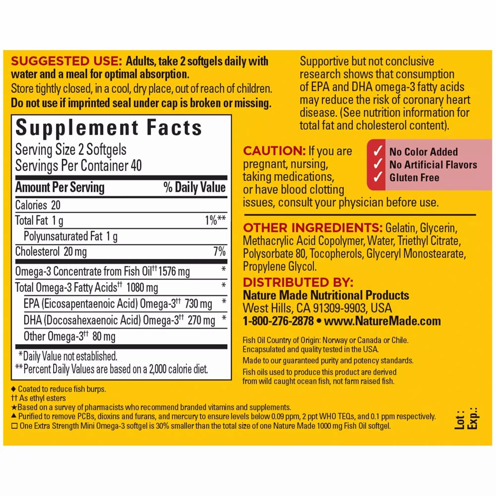 Trust your heart health with Nature Made Burp-Less(2) Extra Strength Mini Omega-3(1) Fish Oil. Because quality matters, all Nature Made Fish Oil products come from wild caught ocean fish, not farm raised fish. The fish oil in this Nature Made fish oil supplement is purified to remove mercury and other contaminants(3). These softgels are also specially coated to reduce fish burps. Nature Made supports leading heart health experts who recommend consuming at least two servings of fatty fish per week. For those who don’t consume fish regularly, an omega 3 supplement like Nature Made Fish Oil can help provide the recommended amount of omega 3s. The omega-3s(1) EPA and DHA in fish oil help support a healthy heart, brain, and eyes. Each serving (2 softgels) of this burp-less(2) mini fish oil supplement provides 1080 mg of total heart-healthy omega-3s(1) (1000 mg EPA and DHA). Research on EPA and DHA made it possible for the FDA to allow a qualified health claim for omega 3s stating “Supportive but not conclusive research shows that consumption of EPA and DHA omega-3 fatty acids may reduce the risk of coronary heart disease. (See nutrition information for total fat and cholesterol content).” (1)As ethyl esters (2)Coated to reduce fish burps. (3)Purified to remove PCBs, dioxins and furans, and mercury to ensure levels below 0.09 ppm, 2 ppt WHO TEQs, and 0.1 ppm respectively.