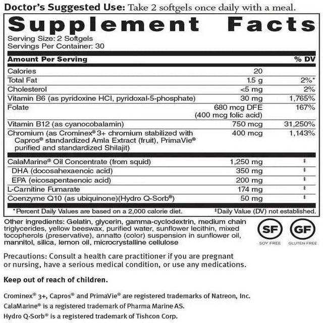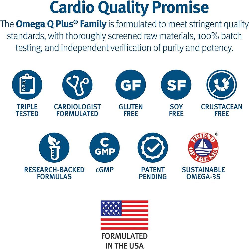 SUPPORTS MULTIPLE HEART HEALTH BENEFITS IN 1 FORMULA PLUS HEALTHY AGING. This formula features heart healthy DHA from CalaMarine omega-3 oil and 50mg of absorbable Hydro Q-Sorb CoQ10 plus Crominex 3+ chromium.,50MG OF COQ10: Lifestyle factors and aging may deplete your CoQ10 levels! With 50mg of CoQ10 in a daily dose, your heart is getting the support it needs. Plus, B vitamins and folic acid for heart and brain health, cellular energy and more. And l-carnitine, a perfect partner to CoQ10.,OMEGA Q PLUS FEATURES A PATENTED, CUTTING-EDGE FORM OF COQ10 called Hydro Q-Sorb, which is up to 3 times more bioavailable than ordinary powdered CoQ10 and up to 7X BETTER absorbed into your cells. The CoQ10 helps to feed the mitochondria, the cellular engines that power your heart, providing help to support a healthy heart and overall well-being.,A FULL DAILY DOSE OF OMEGA-3S WITH CLEAN CALAMARINE...AND NO FISHY BURPS! Supplementing with omega-3s is one of the BEST things you can do for your heart and whole-body health. CalaMarine oil is a clean, odorless omega-3 oil derived from deep-water calamari (squid), not fish. CalaMarine oil gives you Dr. Sinatra's recommended ratio of DHA to EPA to help support your heart and whole-body health.