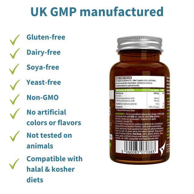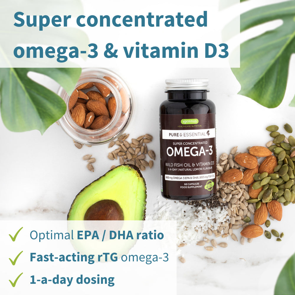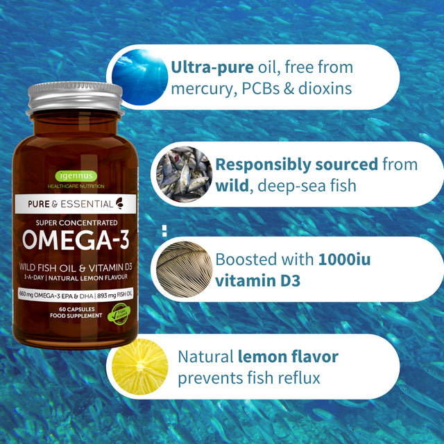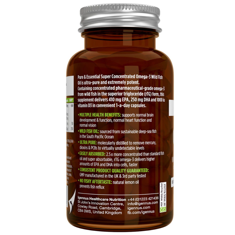 Pure & Essential wild fish oil is a highly absorbable fast-acting omega-3 provided in the advanced re-esterified omega-3 triglyceride form. Each softgel provides 410 mg EPA, 250 mg DHA and 1000 iu vitamin D3. These smaller-than-average softgels are ultra-concentrated and 2-3 times the strength of standard 1-a-day omega-3 supplements. The oil is responsibly sourced from wild, deep-sea anchovies, sardines & mackerel, purified via molecular distillation and free from PCBs, dioxins & mercury. This supplement provides effective support for brain function, vision, heart health and immune function. Each bottle provides 60 softgels (2-month supply).